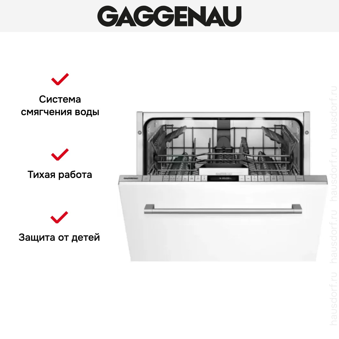 Встраиваемая модель Гаггенау отлично впишется в любой интерьер, главное — правильно выбрать место, чтобы подвести коммуникации. Устанавливается в нишу целиком, полностью закрывается декоративной панелью. Обратите внимание: в комплекте не идет фасад, его необходимо установить самостоятельно. Имеет стандартные размеры, поэтому может не поместиться на очень маленькой кухне. В камеру можно загрузить ограниченное число комплектов: 12 шт. Комплектом считается набор посуды на одного человека, который нужен для полноценного приема пищи: глубокая и плоская тарелки, тарелка для салата, блюдце под чашку, сама чашка, ложка и вилка.