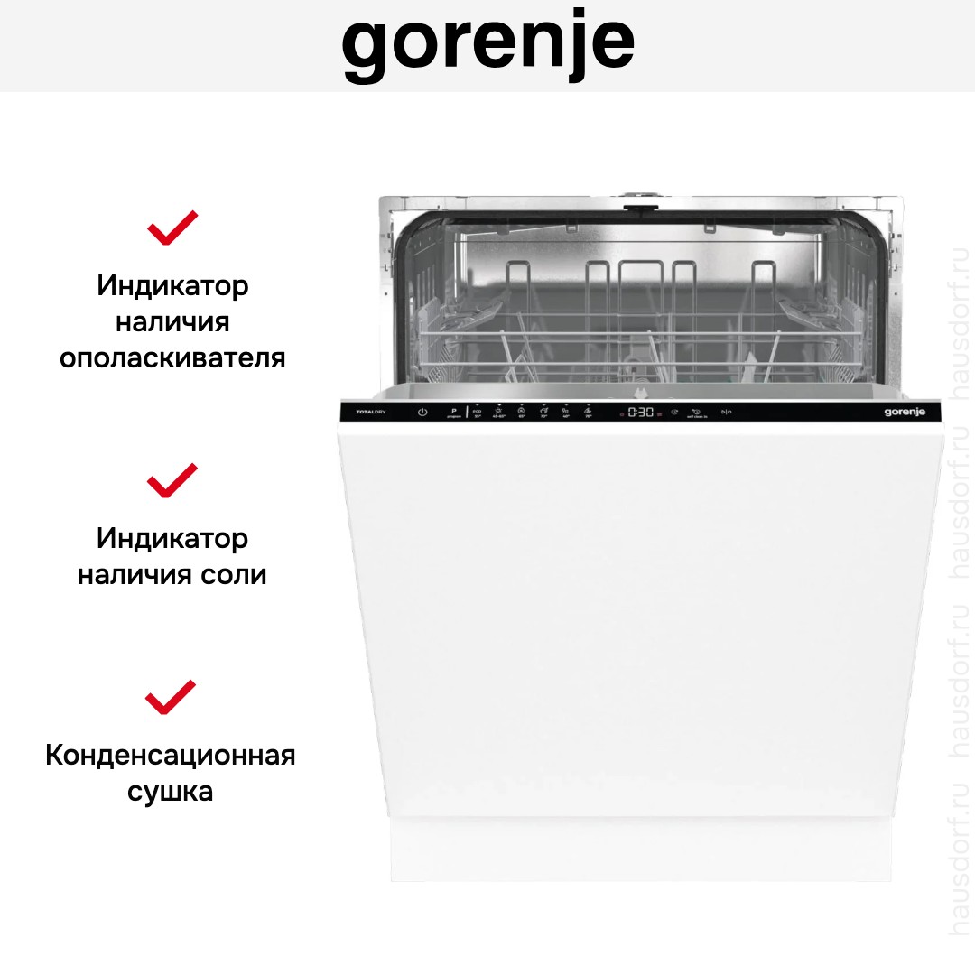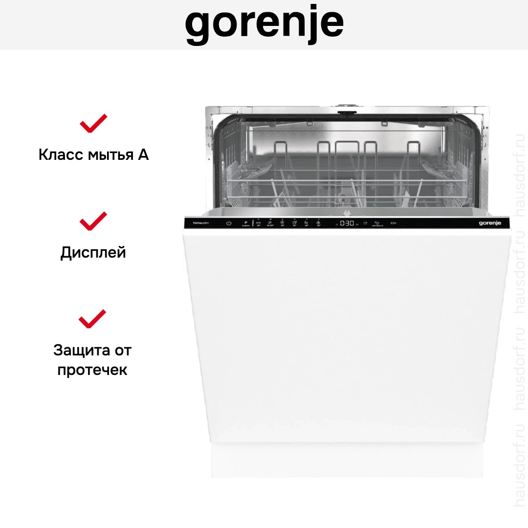 Посудомоечная машина Gorenje GV642D90 предлагает аккуратный встроенный образ, который легко спрячется за фасадом кухни и сохранит единый стиль интерьера. Устройство полностью встраиваемое и имеет закрытую панель управления черного цвета, что оставляет внешнюю сторону мебели чистой и ненавязчивой. Компактные габариты при полноразмерной вместимости — 81.6×59.8×55.5 см — позволяют установить прибор в нишу стандартного размера 82×60×56 см, не жертвуя полезным объемом внутри.