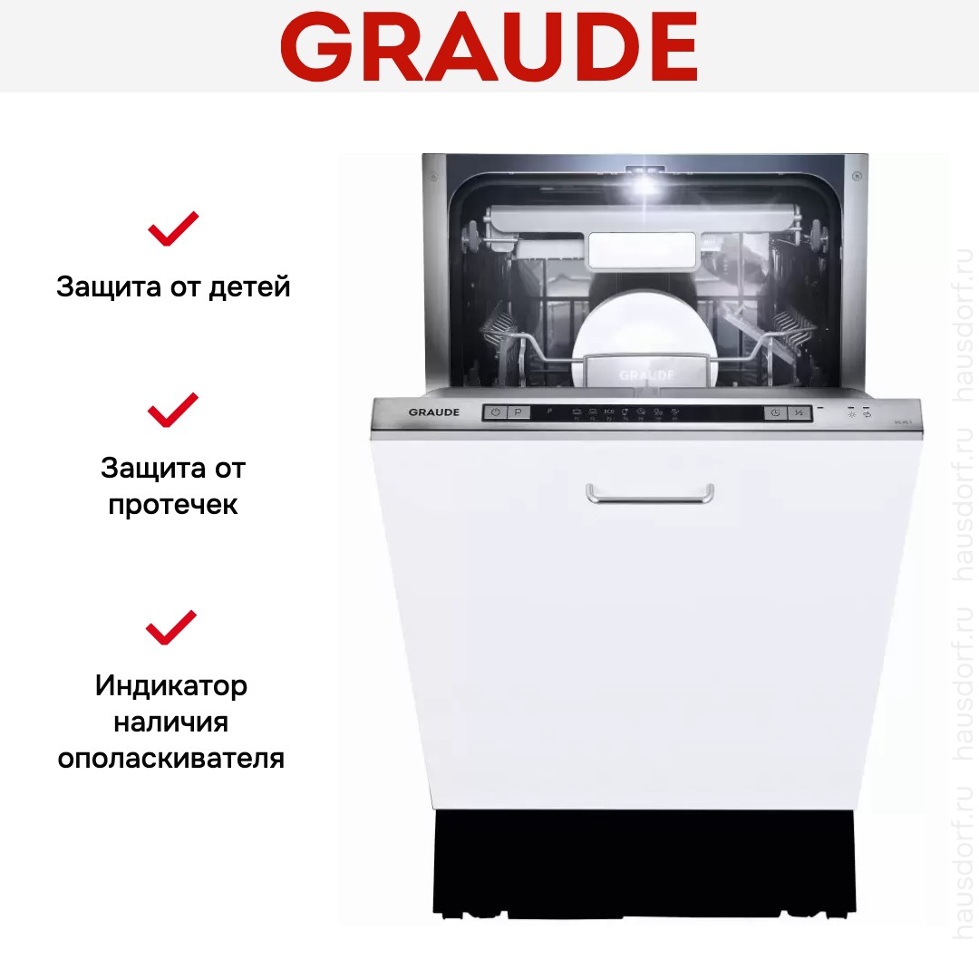 Graude VG 45.1 — узкая посудомоечная машина шириной 45 см. Рабочая камера модели рассчитана на одновременную загрузку до 10 комплектов посуды. Правильное размещение посуды на 3-х уровня повышает эффективность очищения поверхностей столовых приборов.