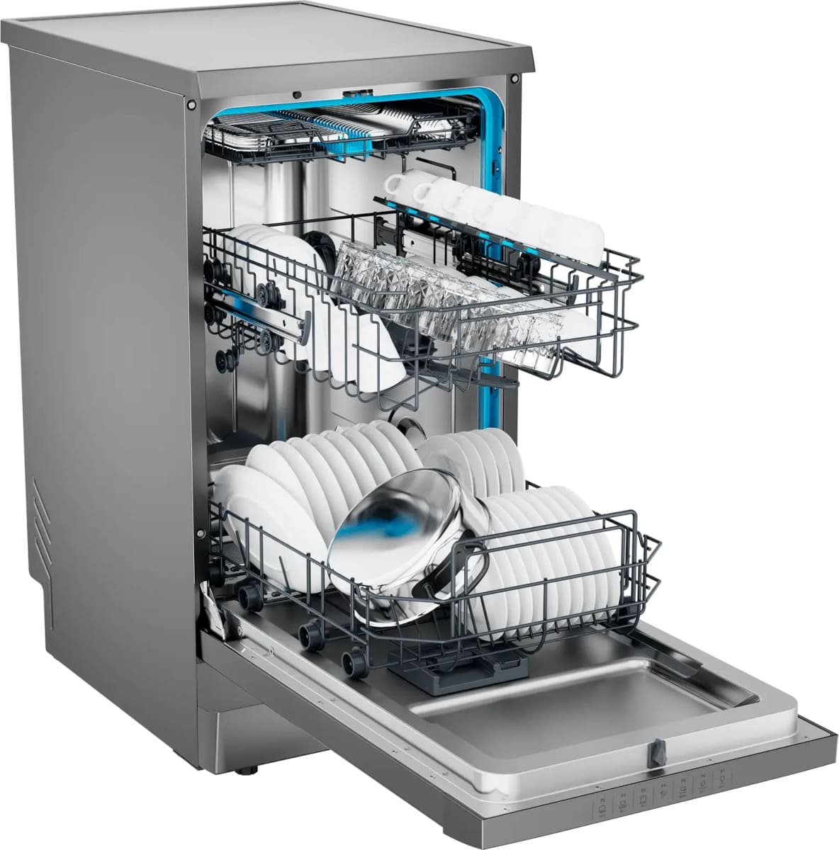 Отдельностоящая модель Хайер отлично впишется в кухонный интерьер, главное — правильно выбрать место, чтобы подвести коммуникации. Имеет уменьшенную ширину — благодаря этому поместится даже на очень маленькой кухне. В камеру можно загрузить ограниченное число комплектов: 11 шт. Комплектом считается набор посуды на одного человека, который нужен для полноценного приема пищи: глубокая и плоская тарелки, тарелка для салата, блюдце под чашку, сама чашка, ложка и вилка.