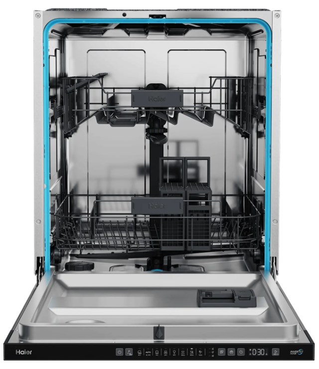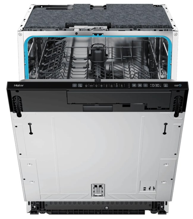 Встраиваемая модель Хайер отлично впишется в любой интерьер, главное — правильно выбрать место, чтобы подвести коммуникации. Устанавливается в нишу целиком, полностью закрывается декоративной панелью. Имеет стандартные размеры, поэтому может не поместиться на очень маленькой кухне. В камеру можно загрузить ограниченное число комплектов: 14 шт. Комплектом считается набор посуды на одного человека, который нужен для полноценного приема пищи: глубокая и плоская тарелки, тарелка для салата, блюдце под чашку, сама чашка, ложка и вилка.