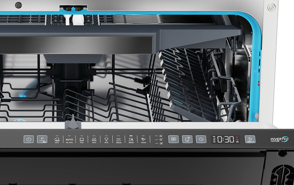 Управление посудомоечной машиной позволяет выбирать температуру мытья, длительность цикла, а также дополнительные опции. Панель управления может располагаться на фасаде прибора, если ПММ отдельностоящая или настольная, или на торце дверцы у встраиваемых моделей.