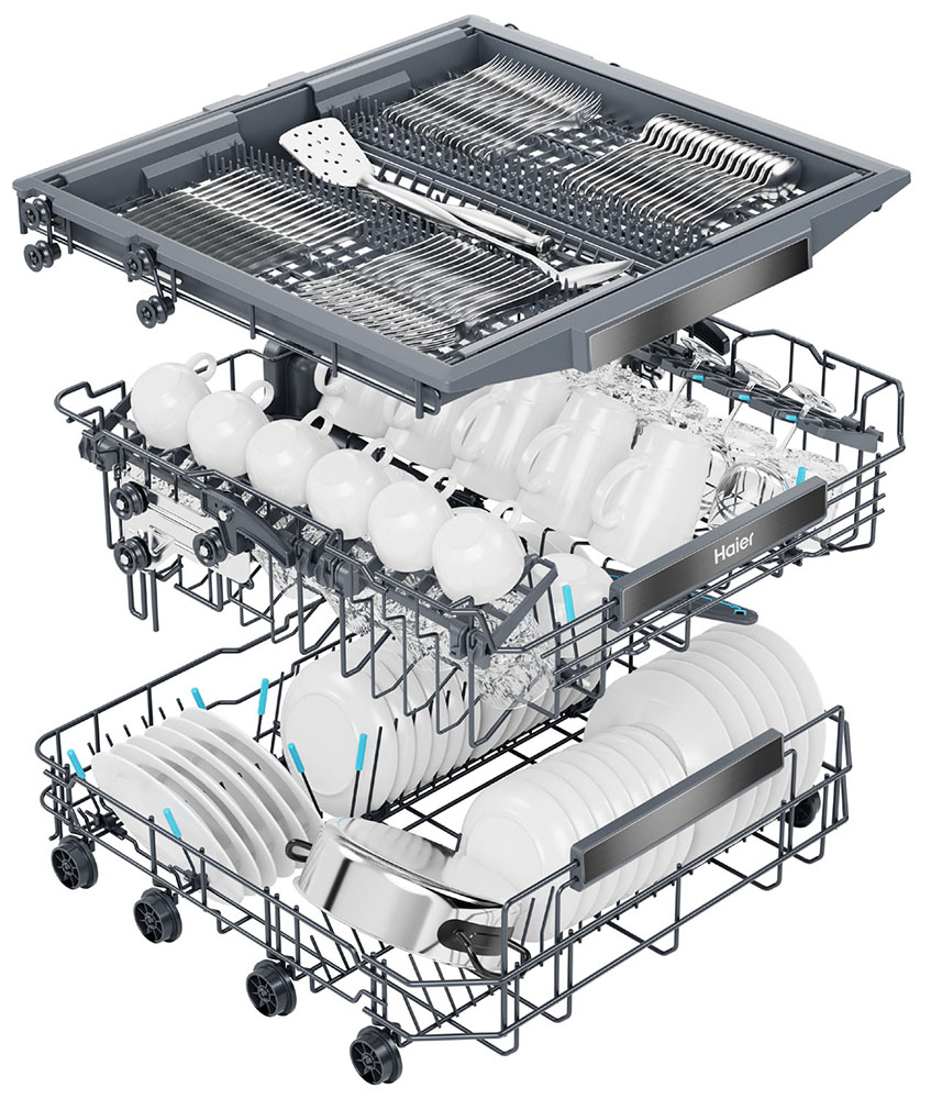 Встраиваемая модель Хайер отлично впишется в любой интерьер, главное — правильно выбрать место, чтобы подвести коммуникации. Устанавливается в нишу целиком, полностью закрывается декоративной панелью. Обратите внимание: в комплекте не идет фасад, его необходимо установить самостоятельно. Имеет стандартные размеры, поэтому может не поместиться на очень маленькой кухне. В камеру можно загрузить ограниченное число комплектов: 16 шт. Комплектом считается набор посуды на одного человека, который нужен для полноценного приема пищи: глубокая и плоская тарелки, тарелка для салата, блюдце под чашку, сама чашка, ложка и вилка.