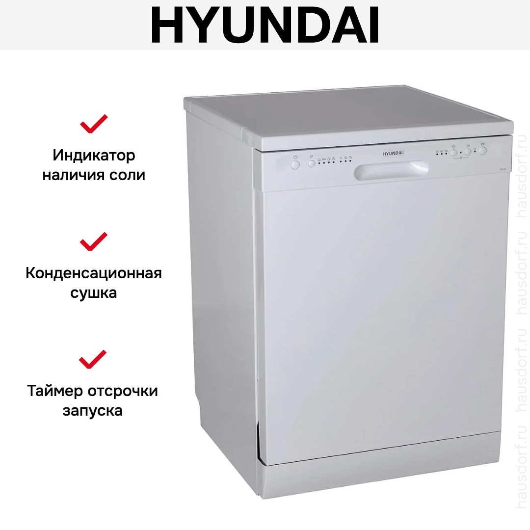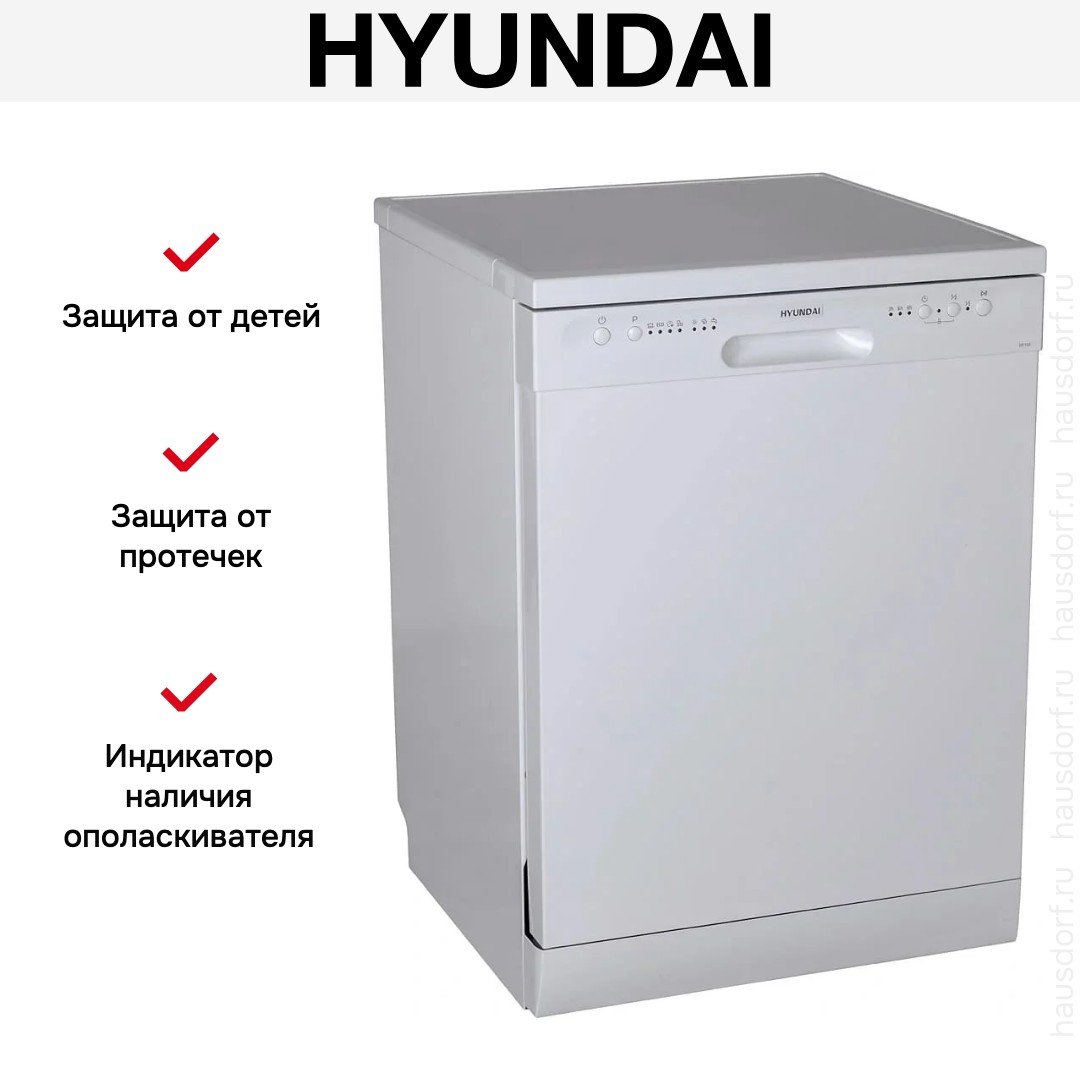 Отдельностоящая модель Хендай отлично впишется в кухонный интерьер, главное — правильно выбрать место, чтобы подвести коммуникации. Имеет стандартные размеры, поэтому может не поместиться на очень маленькой кухне. В камеру можно загрузить ограниченное число комплектов: 12 шт. Комплектом считается набор посуды на одного человека, который нужен для полноценного приема пищи: глубокая и плоская тарелки, тарелка для салата, блюдце под чашку, сама чашка, ложка и вилка.
