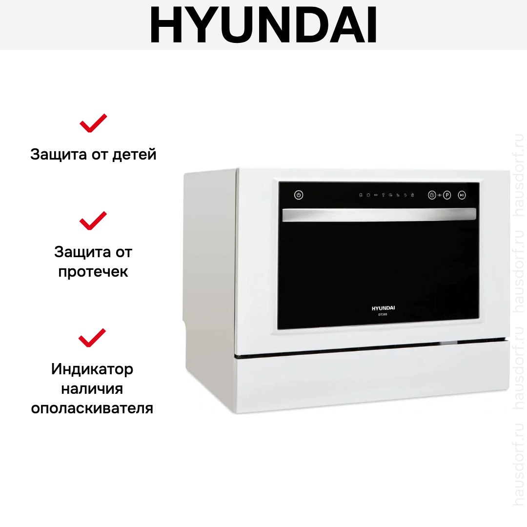 Отдельностоящая модель Хендай отлично впишется в кухонный интерьер, главное — правильно выбрать место, чтобы подвести коммуникации. Компактные размеры позволяют разместить ее даже на очень маленькой кухне. В камеру можно загрузить ограниченное число комплектов: 6 шт. Комплектом считается набор посуды на одного человека, который нужен для полноценного приема пищи: глубокая и плоская тарелки, тарелка для салата, блюдце под чашку, сама чашка, ложка и вилка.
