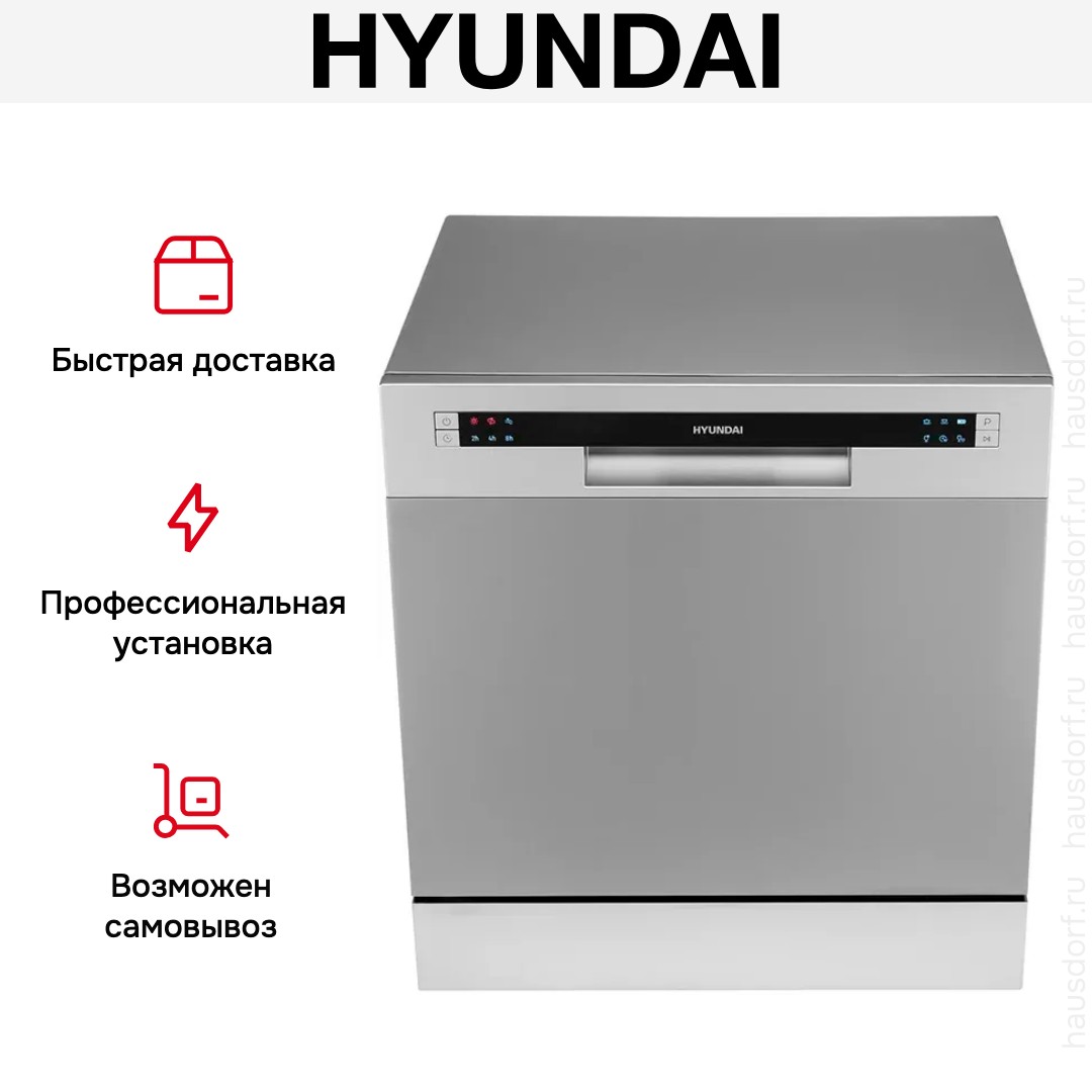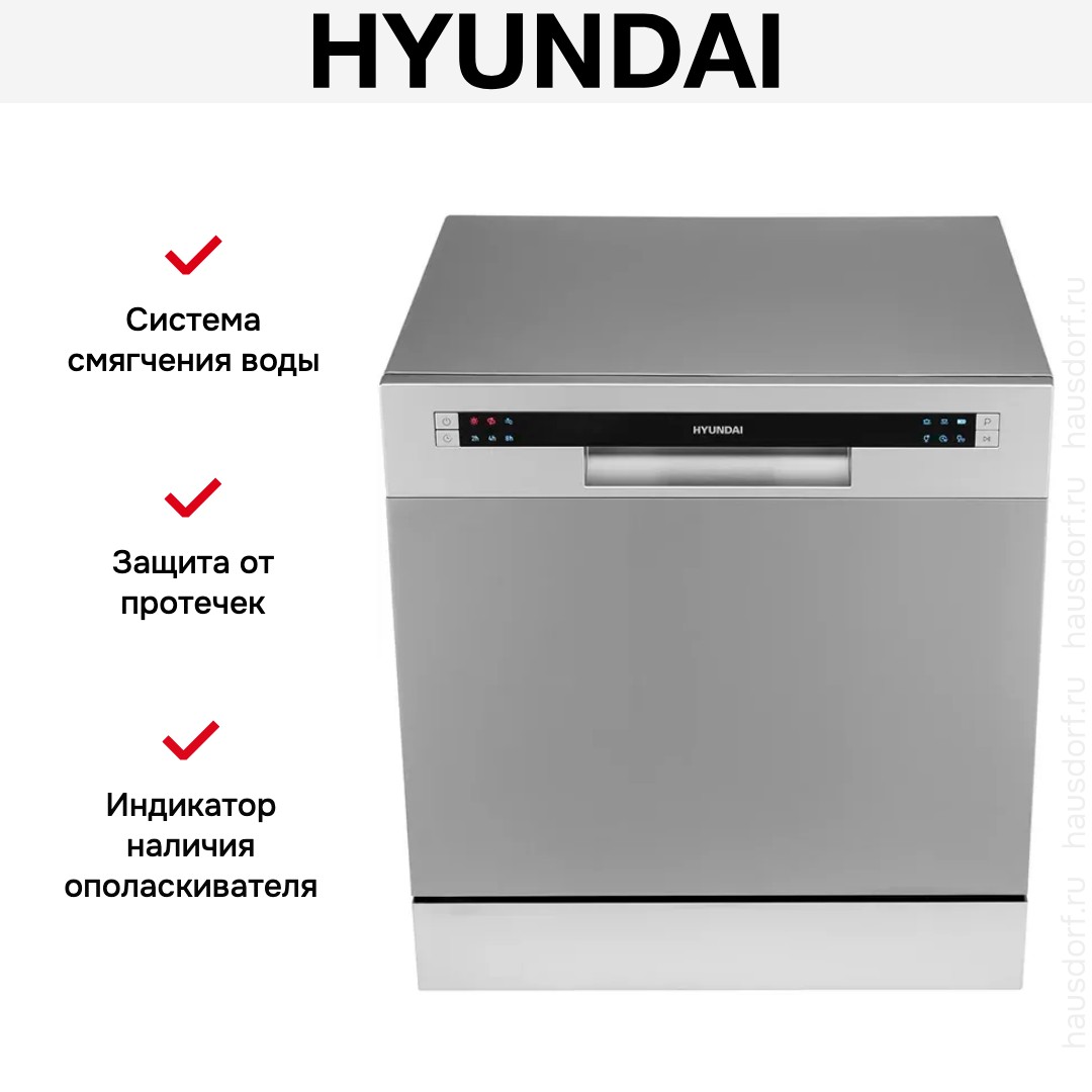 Отдельностоящая модель Хендай отлично впишется в кухонный интерьер, главное — правильно выбрать место, чтобы подвести коммуникации. Компактные размеры позволяют разместить ее даже на очень маленькой кухне. В камеру можно загрузить ограниченное число комплектов: 8 шт. Комплектом считается набор посуды на одного человека, который нужен для полноценного приема пищи: глубокая и плоская тарелки, тарелка для салата, блюдце под чашку, сама чашка, ложка и вилка.