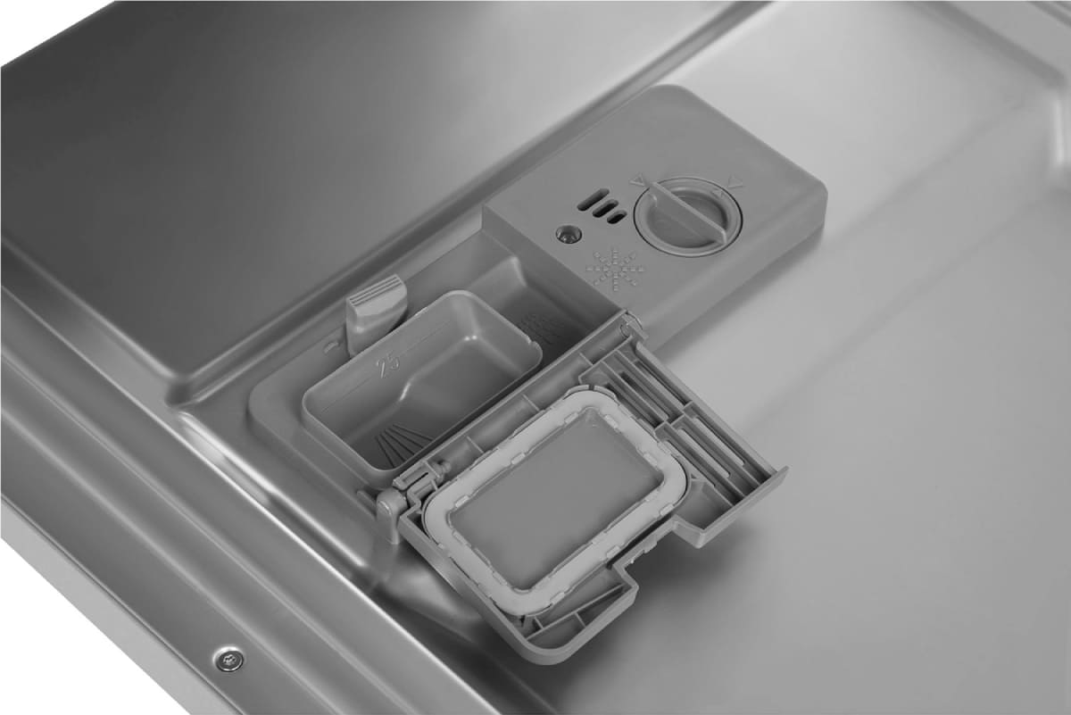 Для качественного мытья требуются три компонента. Порошок служит для удаления загрязнений. Ополаскиватель на последнем этапе рабочего цикла гарантирует скатывание капель воды и придает посуде эффектный блеск. Соль нейтрализует примеси, содержащиеся в жесткой водопроводной воде, и защищает внутренние поверхности и механизм посудомойки от накипи путем смягчения воды. Соль содержит ионы хлора, которые связывают ионы металлов, находящиеся в воде, и не дают им оседать в виде налета. Применение соли необходимо для стабильной работы машины, причем заменять ее обычной поваренной солью не рекомендуется.