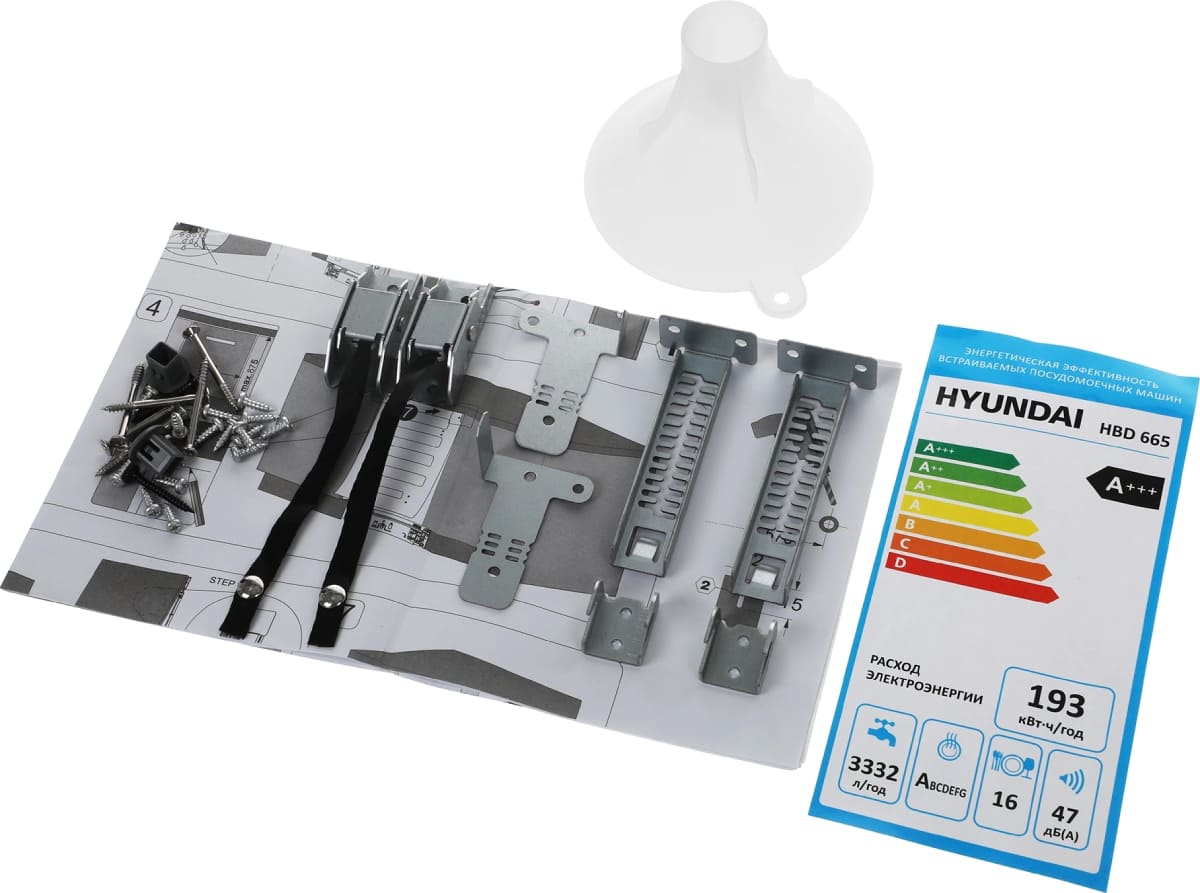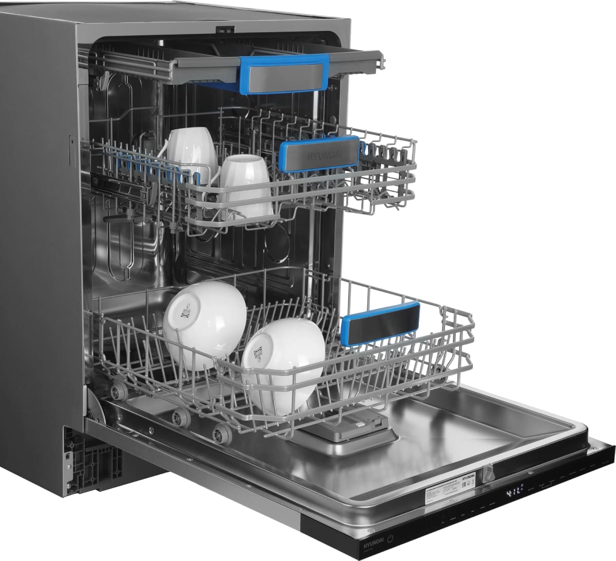 Встраиваемая модель Хендай отлично впишется в любой интерьер, главное — правильно выбрать место, чтобы подвести коммуникации. Устанавливается в нишу целиком, полностью закрывается декоративной панелью. Обратите внимание: в комплекте не идет фасад, его необходимо установить самостоятельно. Имеет стандартные размеры, поэтому может не поместиться на очень маленькой кухне. В камеру можно загрузить ограниченное число комплектов: 16 шт. Комплектом считается набор посуды на одного человека, который нужен для полноценного приема пищи: глубокая и плоская тарелки, тарелка для салата, блюдце под чашку, сама чашка, ложка и вилка.