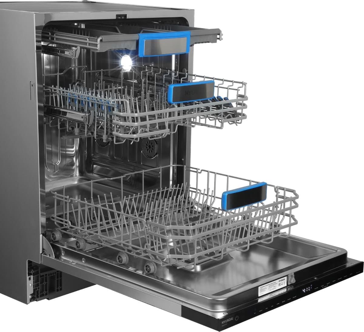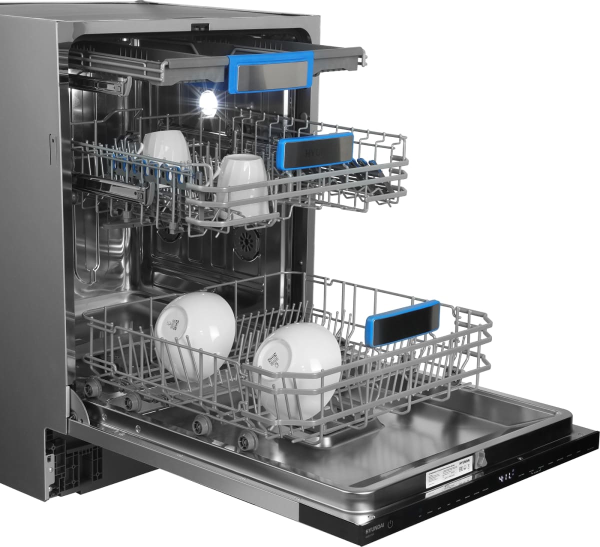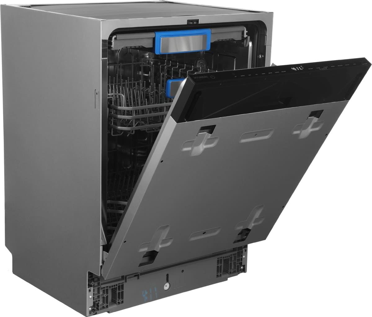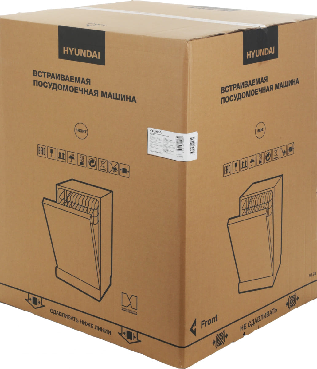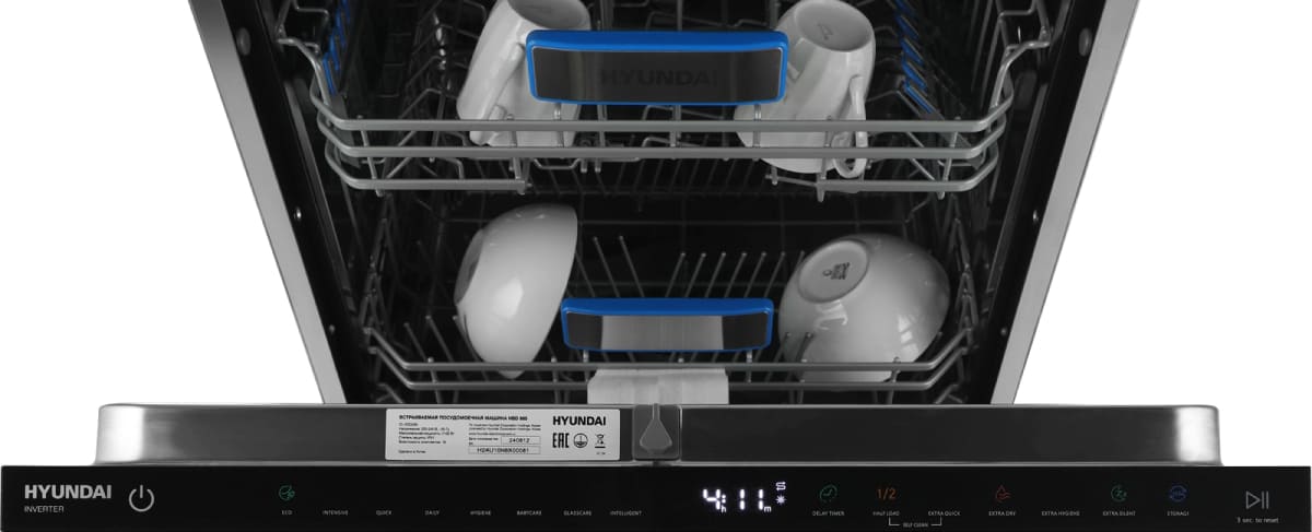 Встраиваемая модель Хендай отлично впишется в любой интерьер, главное — правильно выбрать место, чтобы подвести коммуникации. Устанавливается в нишу целиком, полностью закрывается декоративной панелью. Обратите внимание: в комплекте не идет фасад, его необходимо установить самостоятельно. Имеет стандартные размеры, поэтому может не поместиться на очень маленькой кухне. В камеру можно загрузить ограниченное число комплектов: 16 шт. Комплектом считается набор посуды на одного человека, который нужен для полноценного приема пищи: глубокая и плоская тарелки, тарелка для салата, блюдце под чашку, сама чашка, ложка и вилка.