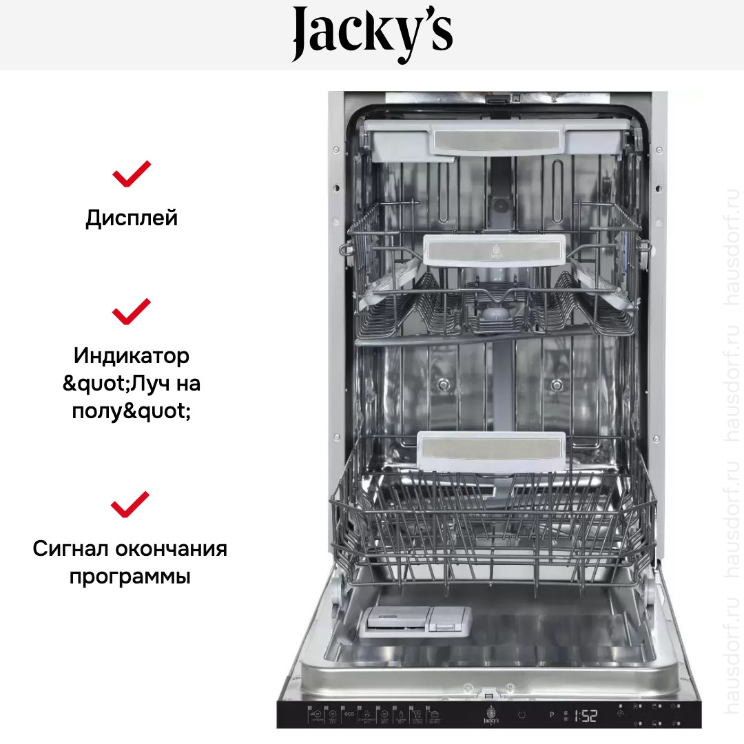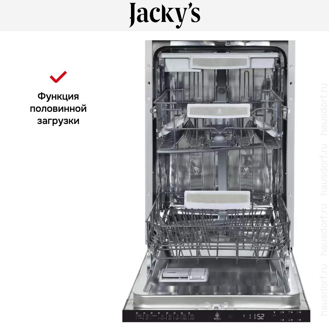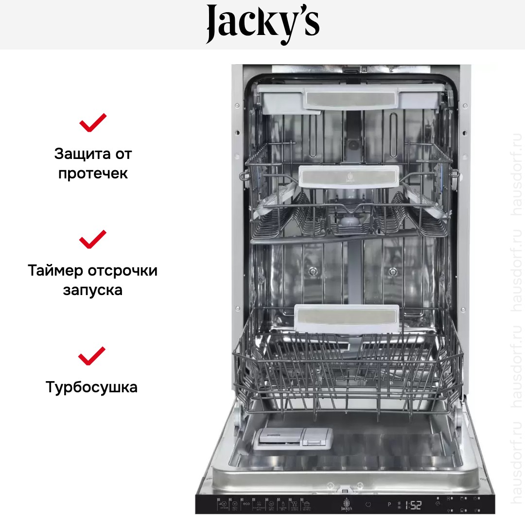 Jacky’s JD SB5301 — посудомоечная машина вместимостью 10 комплектов посуды с турбосушкой. Оснащена LED дисплеем. Функция Aqua Stop защитит от потопа: в случае протечки вода будет перекрыта. Предусмотрена опция отсрочки старта до 19 часов, благодаря которой вы можете выбрать удобное время начала работы устройства.