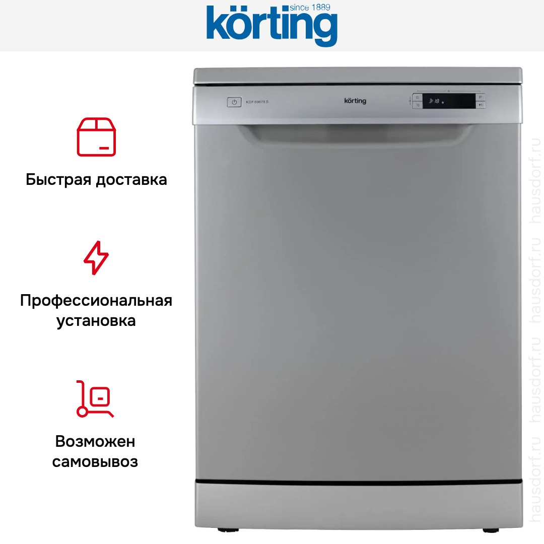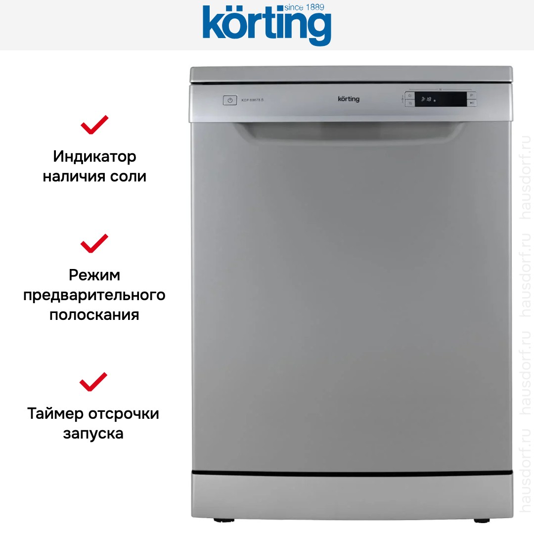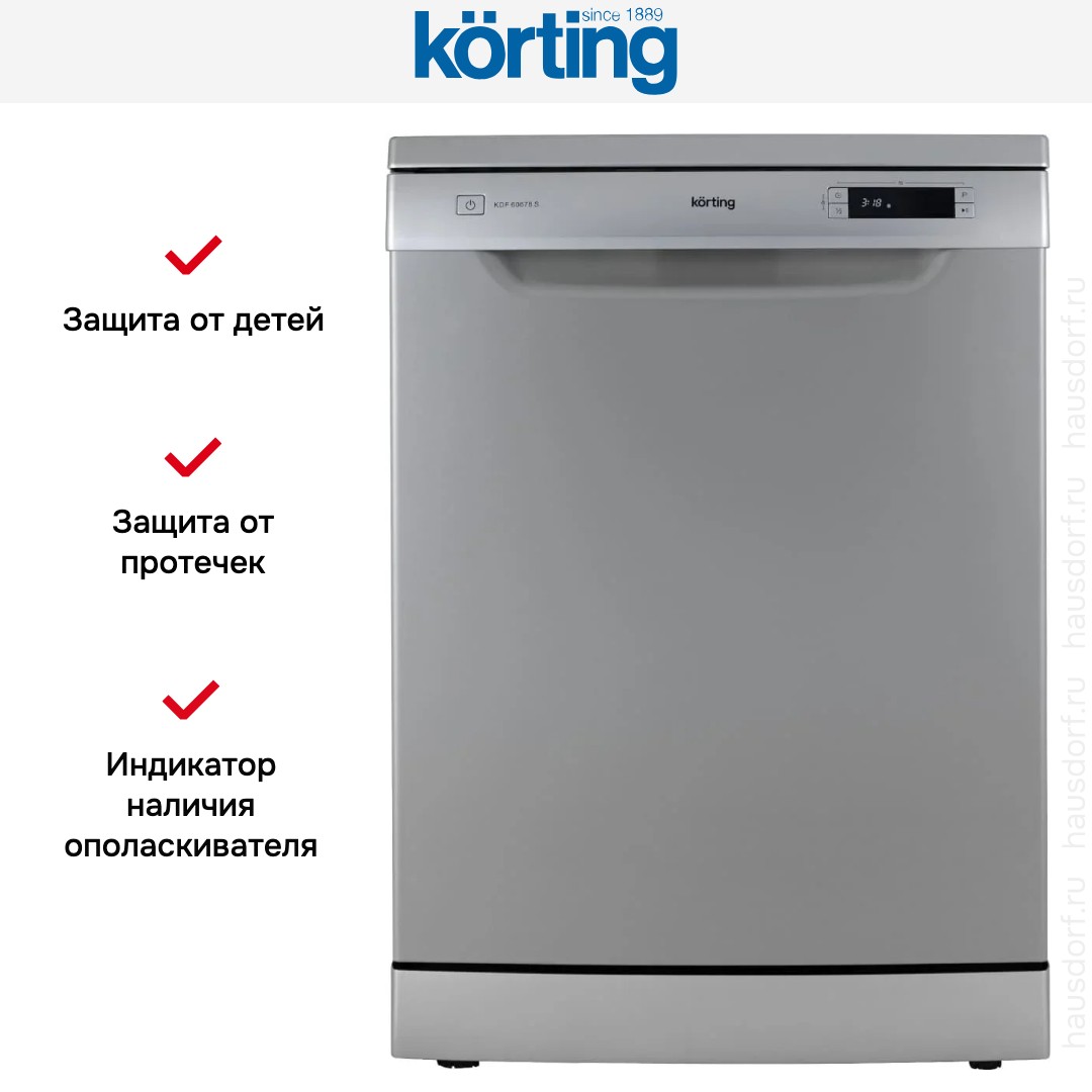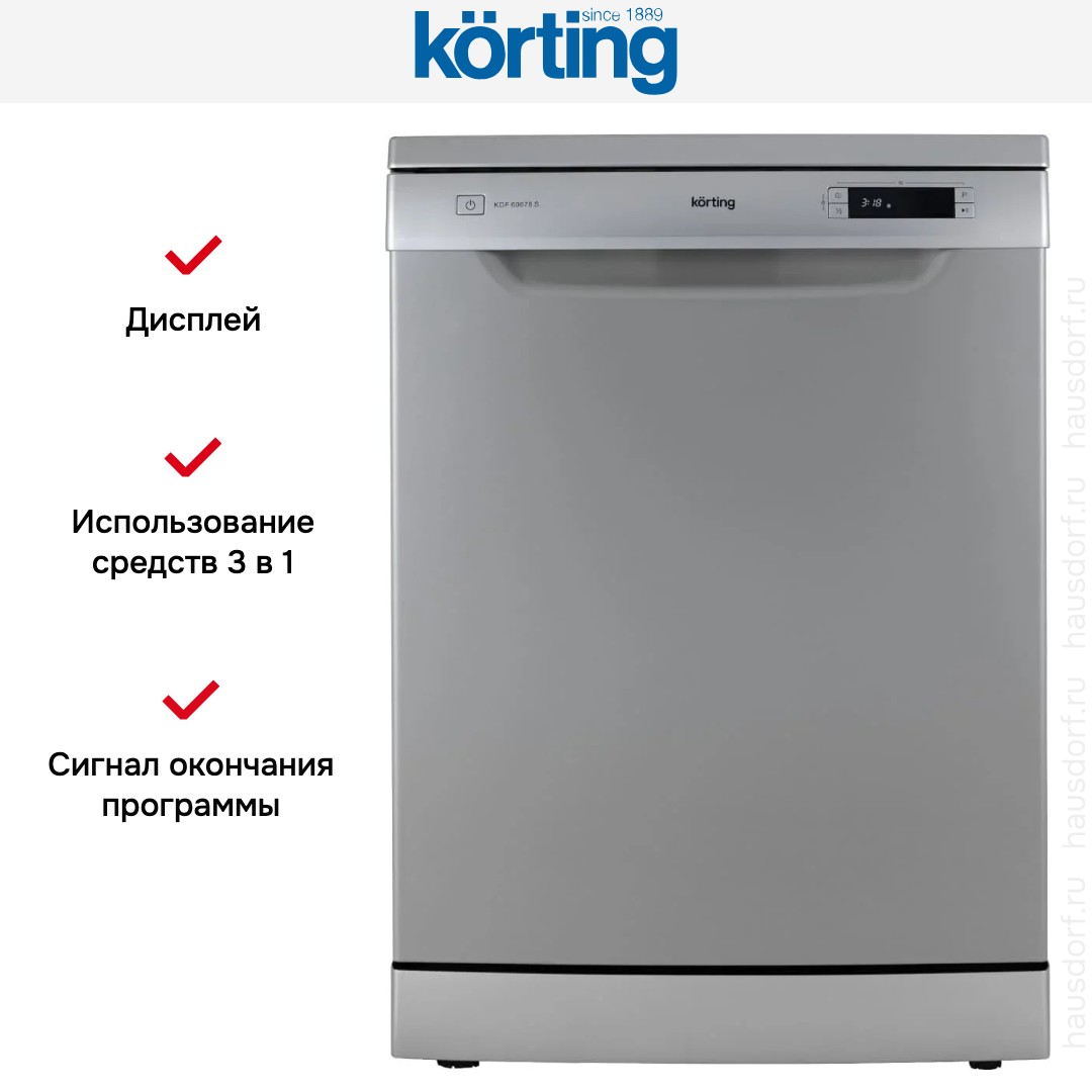 Посудомоечная машина Korting KDF 60678 S сочетает солидный серебристый корпус с лаконичной открытой панелью управления, что делает её органичной в современной кухне. Внешний дизайн строгий, но не броский. Модель является полноразмерной, что при высоте 84.5 см и ширине 59.8 см обеспечивает привычный объем загрузки.