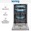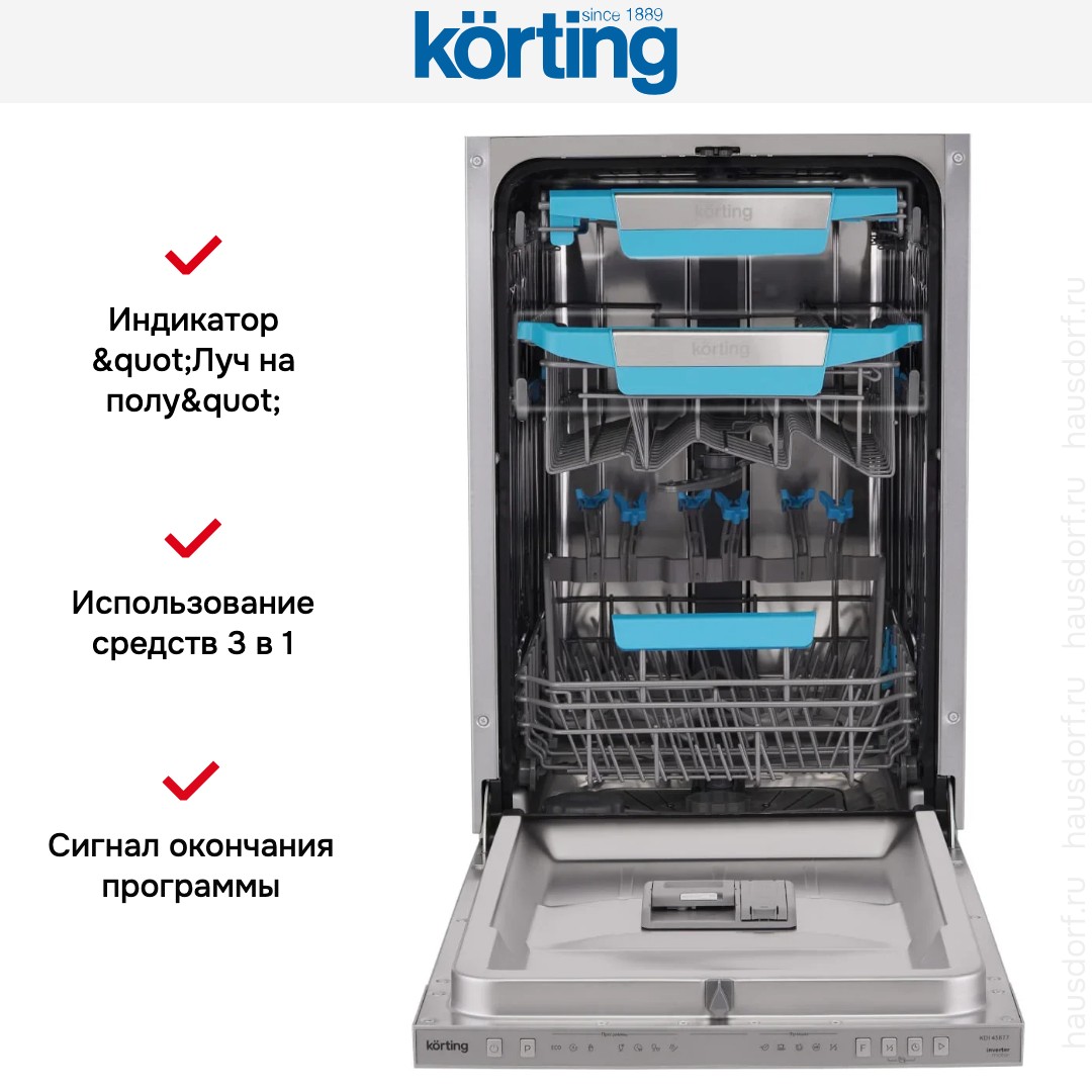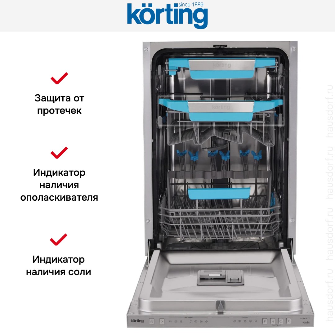 Встраиваемая посудомоечная машина Korting KDI 45877 — это компактный полностью встраиваемый прибор узкой ширины, созданный для квартир и небольших кухонь, где важна экономия пространства без компромиссов по качеству мойки. Устройство высотой 81,5 см, шириной 44,8 см и глубиной 55 см впишется в нишу 82—88×45×55 см, а при открытой дверце требует всего 115 см глубины, что облегчает планирование расстановки мебели. Интерьер рассчитан на 10 комплектов посуды, корзины продуманы до мелочей: регулируемая по высоте верхняя корзина, полочка для чашек в верхнем лотке, полка для столовых приборов и направляющие для тарелок в обоих ярусах обеспечивают гибкую загрузку различных предметов; дополнительный фиксатор для бокалов помогает безопасно разместить хрупкую посуду. Панель управления электронная и скрытая под фасадом, серебристая лицевая часть и цифровой дисплей создают сдержанный внешний вид, а кнопки включения и выбора режимов интуитивно понятны; предусмотрен таймер отсрочки от 1 до 24 часов, индикаторы соли и ополаскивателя, световой сигнал окончания и инновационный «луч на полу» для удобного контроля работы. В арсенале — семь стандартных программ, включая Baby Care, а также автоматические циклы, интенсивная мойка для сильных загрязнений, щадящие режимы для деликатных предметов, быстрый цикл и опция предварительного полоскания; предусмотрены половинная загрузка, эко-режим и функция «Экономия времени», что позволяет подбирать оптимальное сочетание результативности и расходов ресурсов. Для качественной сушки применяется активная система с дополнительной функцией Экстра-сушка и режимом Турбо+, а автоматическое открытие дверцы в конце цикла улучшает испарение влаги. Технологическая начинка включает инверторный мотор для тихой и долговечной работы, проточный водонагреватель для стабильной температуры, использование средств «3 в 1» и эффективный фильтр; система разбрызгивателей S-Form и верхний распылитель обеспечивают равномерное омывание посуды. Безопасность представлена системой AquaControl и автоматическим отключением при неисправностях; среди индикаторов также сигнал об отсутствии подачи воды. В комплекте идут тестер жесткости, заливной и сливной шланги (1,6 и 1,4 м соответственно), воронка для соли, мерная ложка и стакан — всё необходимое для установки и запуска. Характеристики потребления впечатляют: расход воды 9 л на цикл и 2520 л в год при классе энергопотребления A+++, энергозатраты 0,674 кВт·ч за цикл и 193 кВт·ч в год. Уровень шума 44 дБ делает эксплуатацию комфортной, масса 32,57 кг (брутто 37,1 кг) облегчает монтаж, а регулируемые ножки упрощают выравнивание. Эта модель сочетает продуманный дизайн, экономичный режим работы и широкий набор опций, которые пригодятся для ежедневного использования и позволят поддерживать кухню в идеальном порядке при минимальных затратах воды и электроэнергии.