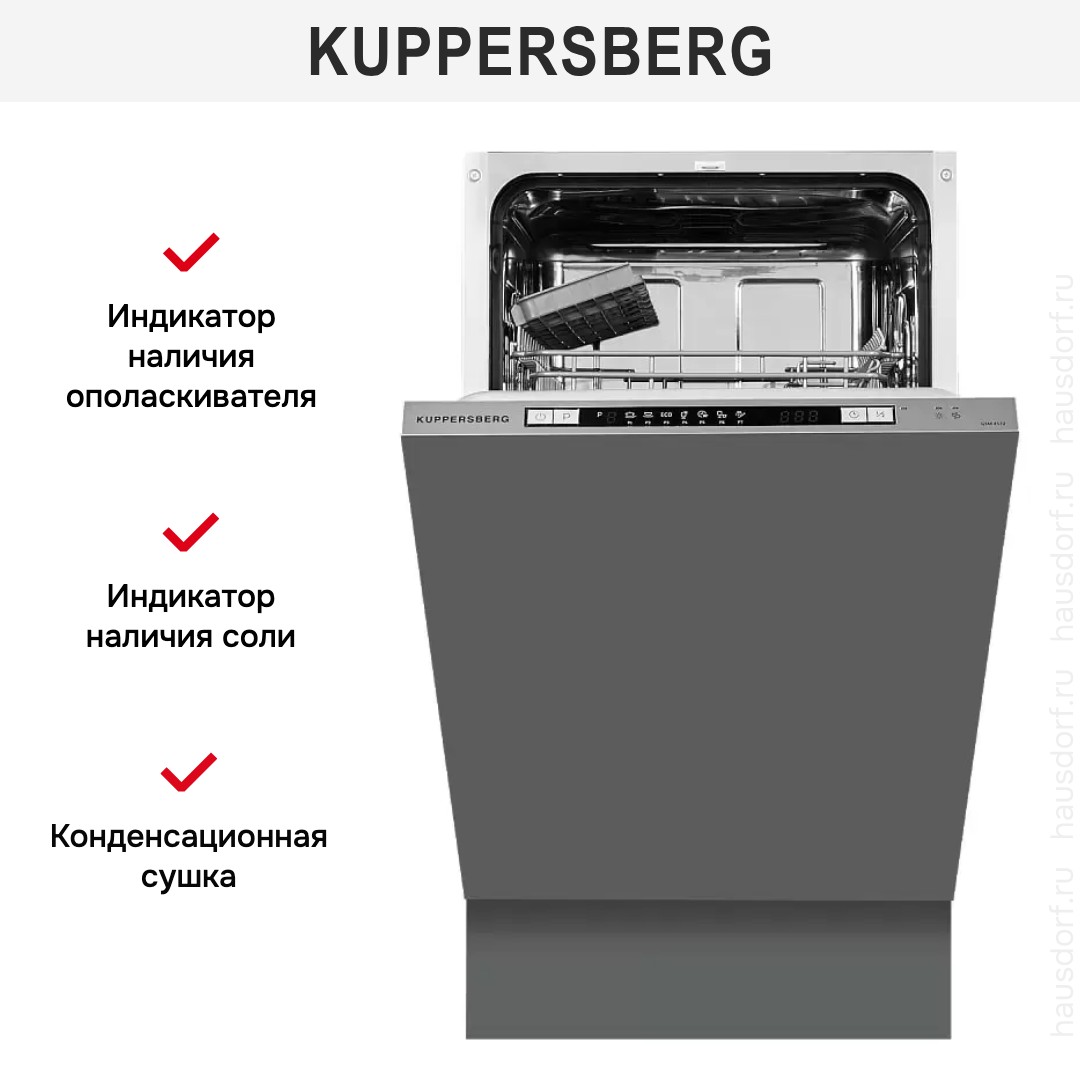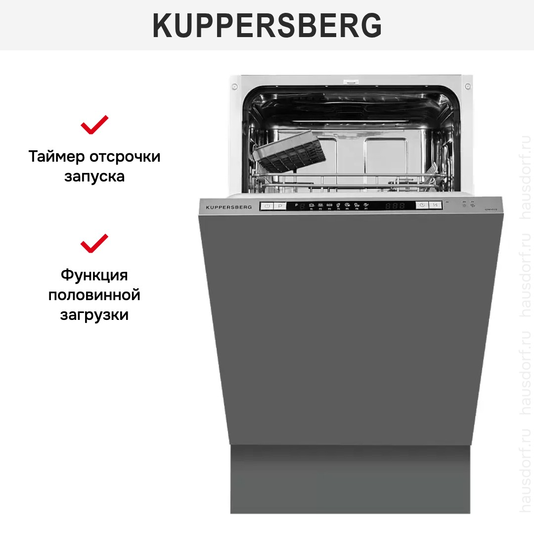 Встраиваемая посудомоечная машина Kuppersberg GSM 4572 — компактное, но технологически оснащённое устройство, созданное для безупречной очистки посуды в условиях ограниченного пространства. Ширина корпуса всего 45 см позволяет легко встроить технику даже в небольшие кухонные гарнитуры, студии или дачные интерьеры, не жертвуя при этом функциональностью. Несмотря на уменьшенные габариты, модель вмещает до 10 комплектов кухонной утвари, что делает её идеальной для пар, молодых семей или ежедневного использования в компактных помещениях.