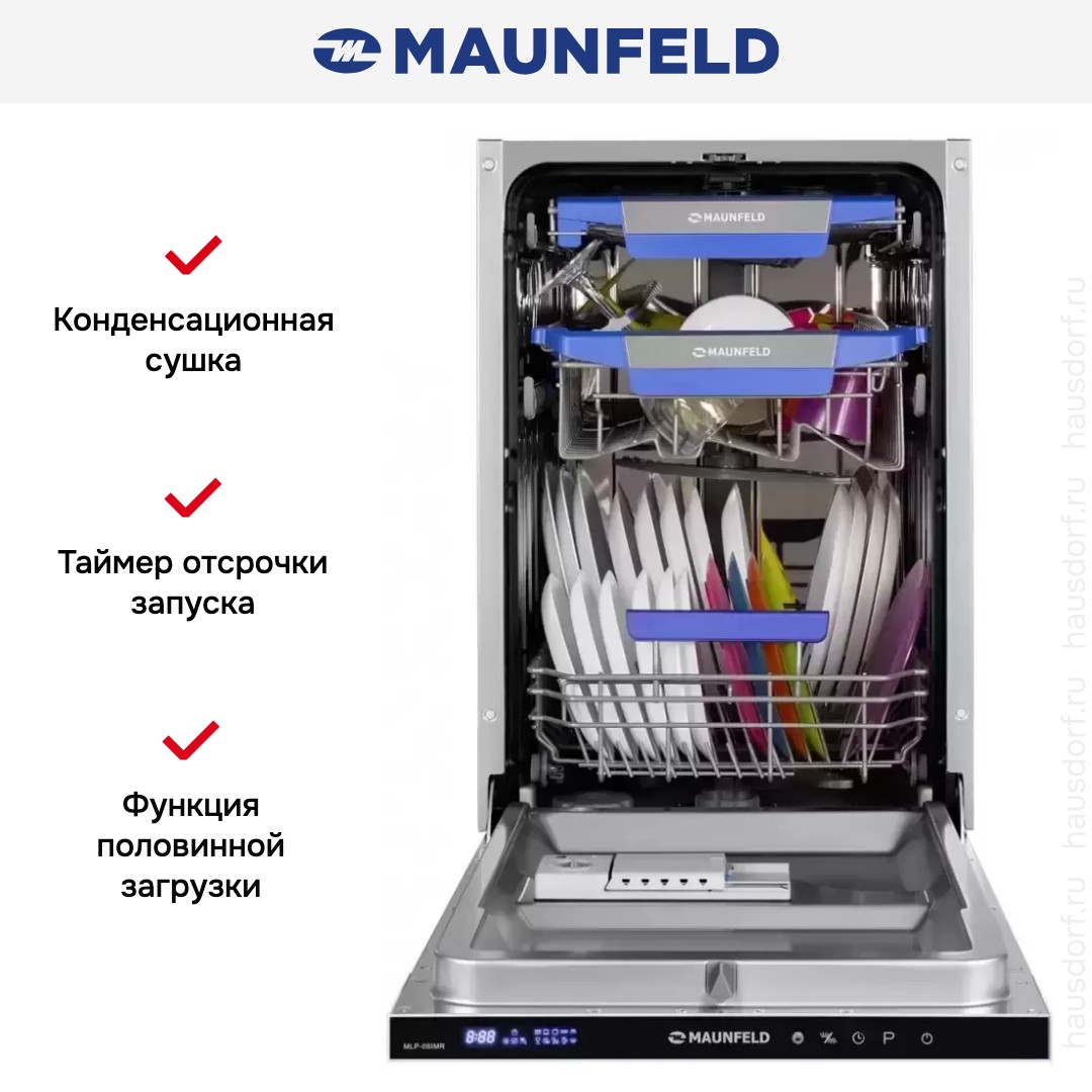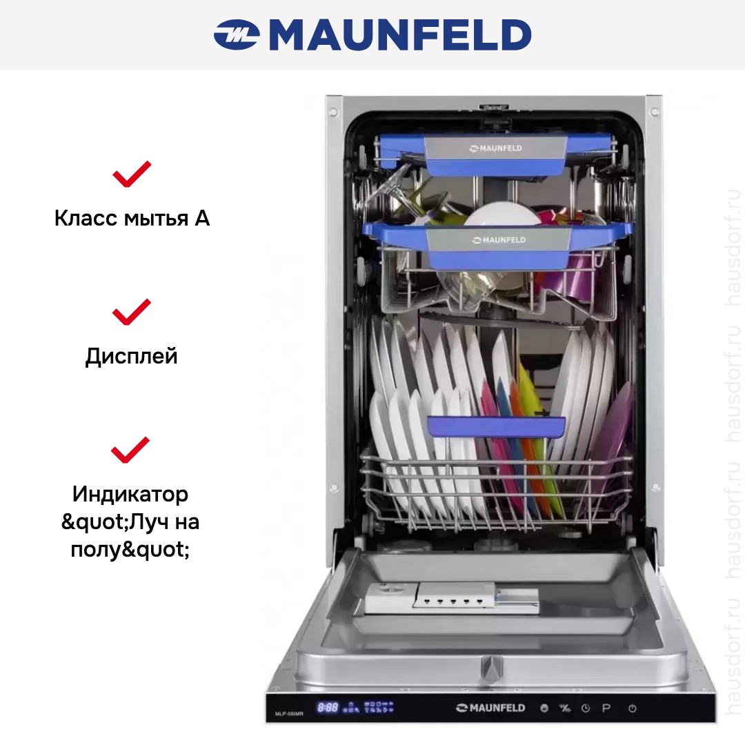 Встраиваемая посудомоечная машина MAUNFELD MLP08IMR хорошо подходит для малогабаритных помещений: она компакта и помещается даже в небольшую нишу. Основные достоинства модели: