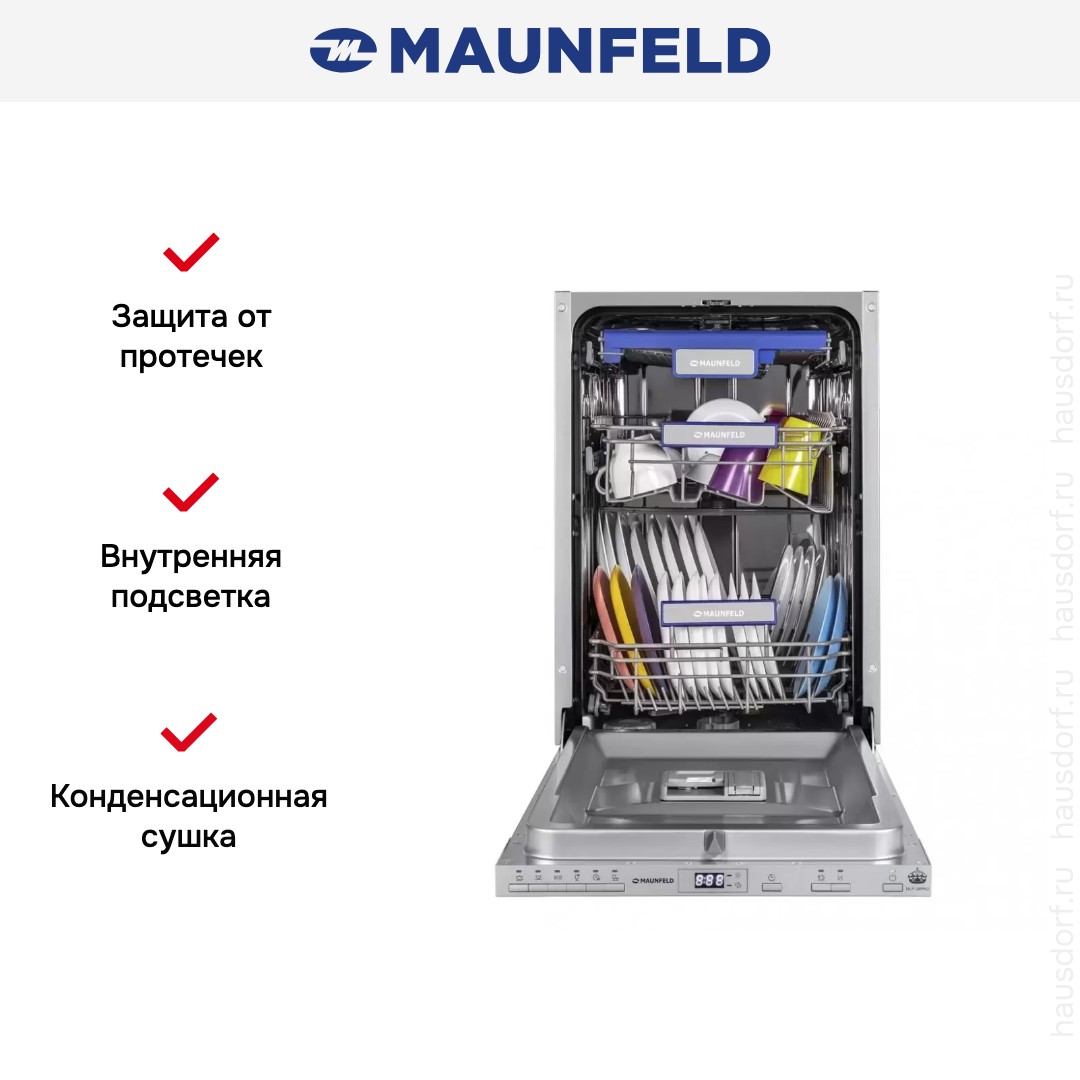 Встраиваемая посудомоечная машина MAUNFELD MLP08PRO хорошо подходит для небольшой семьи из двух или трех человек, она отличается компактностью и эффективностью. Основные достоинства модели: