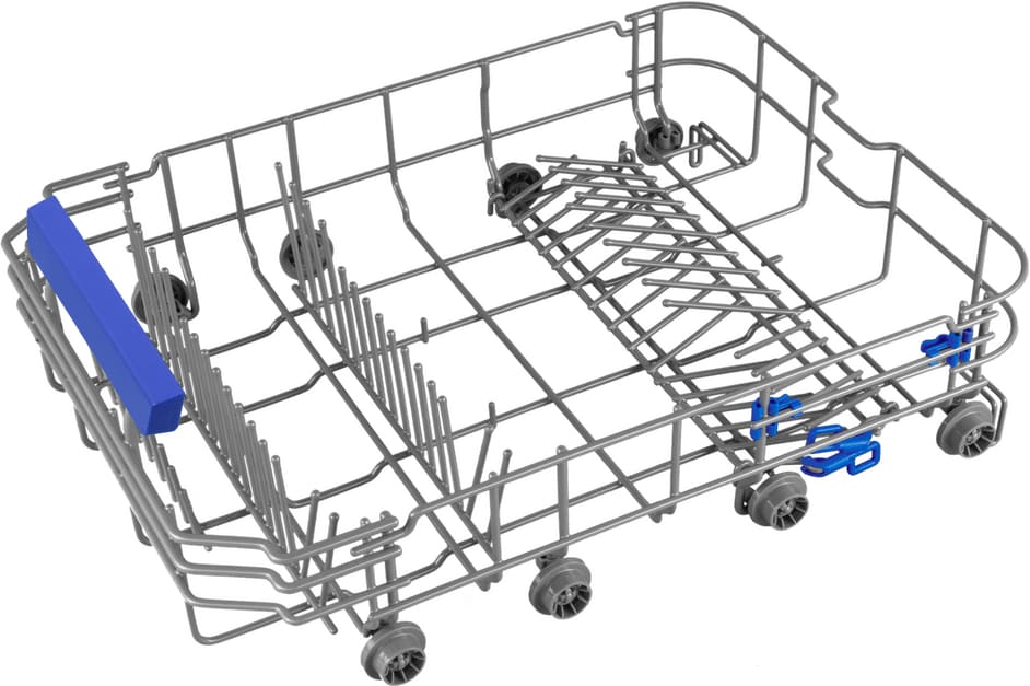 Верхняя корзина может регулироваться по высоте, так что при необходимости в нее можно поместить тарелки большего размера. Нижняя корзина позволяет установить вертикально большие суповые тарелки и блюда большого диаметра — для этого верхнюю корзину можно поднять выше. Тарелки обычно устанавливаются в откидные рамки-держатели, которые легко складываются на дно корзины. Всю посуду в нижней корзине рекомендуется устанавливать без соприкосновения предметов друг с другом, углублением к центру для более интенсивного воздействия струй воды на внутреннюю часть посуды.