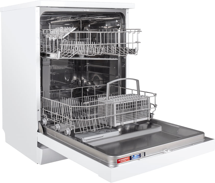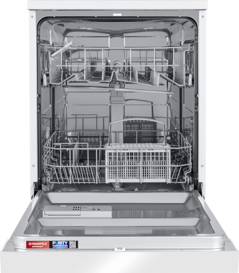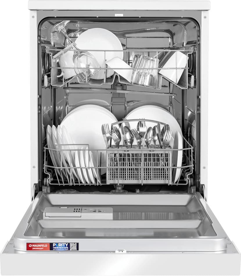 Отдельностоящая модель Маунфилд отлично впишется в кухонный интерьер, главное — правильно выбрать место, чтобы подвести коммуникации. Имеет стандартные размеры, поэтому может не поместиться на очень маленькой кухне. В камеру можно загрузить ограниченное число комплектов: 12 шт. Комплектом считается набор посуды на одного человека, который нужен для полноценного приема пищи: глубокая и плоская тарелки, тарелка для салата, блюдце под чашку, сама чашка, ложка и вилка.