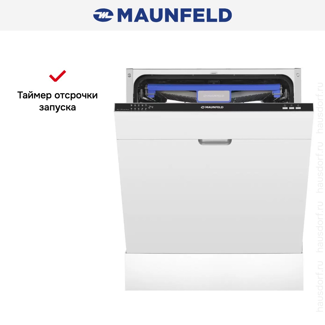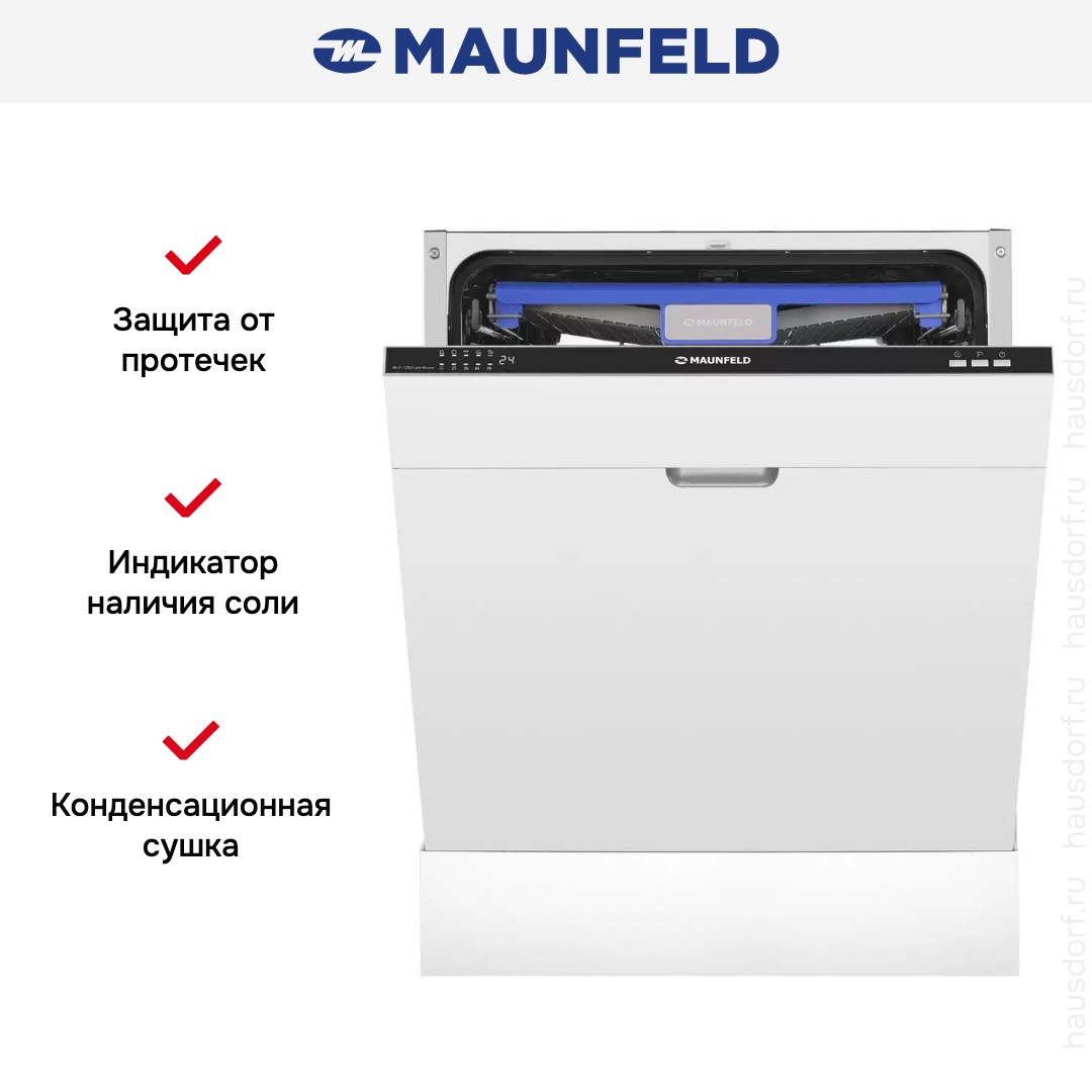 Посудомоечная машина Maunfeld MLP-123I Light Beam — встроенный полноразмерный прибор, который легко интегрируется под фасад кухни и сохраняет строгий внешний вид. Ее конфигурация рассчитана на установку в нишу 82×60×55 см, а размеры самого аппарата 81,5×59,8×55 см. Благодаря полностью встраиваемой конструкции рабочая панель скрыта под декоративной дверцей, что обеспечивает единый стиль кухни.