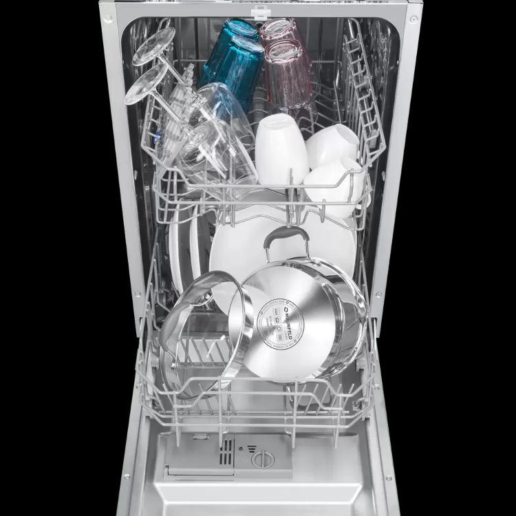 Встраиваемая модель Маунфилд отлично впишется в любой интерьер, главное — правильно выбрать место, чтобы подвести коммуникации. Устанавливается в нишу целиком, полностью закрывается декоративной панелью. Обратите внимание: в комплекте не идет фасад, его необходимо установить самостоятельно. Имеет уменьшенную ширину — благодаря этому поместится даже на очень маленькой кухне. В камеру можно загрузить ограниченное число комплектов: 9 шт. Комплектом считается набор посуды на одного человека, который нужен для полноценного приема пищи: глубокая и плоская тарелки, тарелка для салата, блюдце под чашку, сама чашка, ложка и вилка.