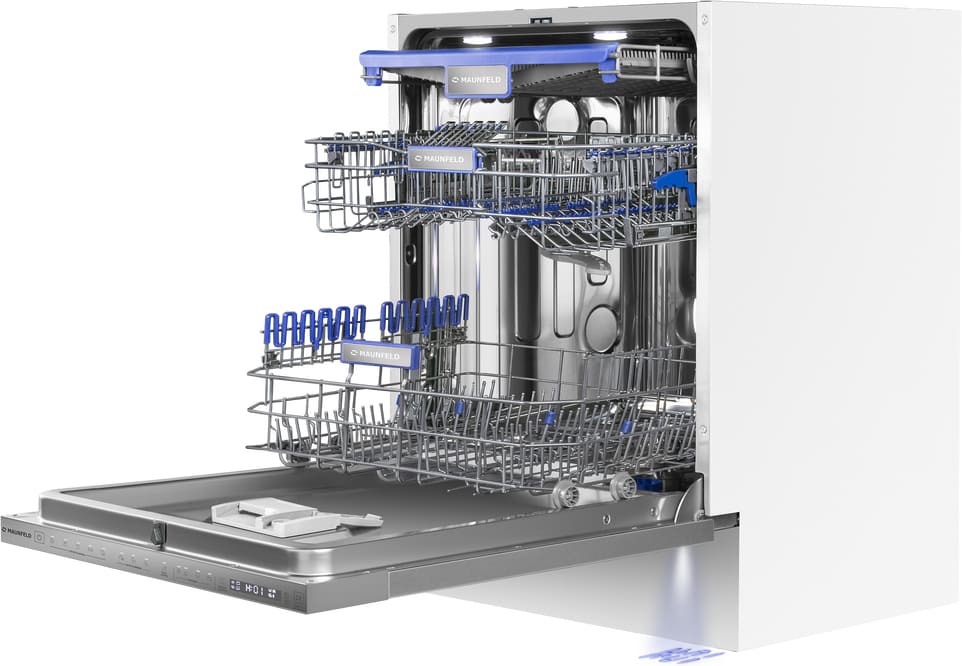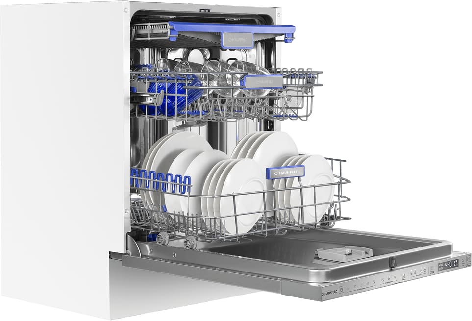 Встраиваемая модель Маунфилд отлично впишется в любой интерьер, главное — правильно выбрать место, чтобы подвести коммуникации. Устанавливается в нишу целиком, полностью закрывается декоративной панелью. Обратите внимание: в комплекте не идет фасад, его необходимо установить самостоятельно. Имеет стандартные размеры, поэтому может не поместиться на очень маленькой кухне. В камеру можно загрузить ограниченное число комплектов: 16 шт. Комплектом считается набор посуды на одного человека, который нужен для полноценного приема пищи: глубокая и плоская тарелки, тарелка для салата, блюдце под чашку, сама чашка, ложка и вилка.