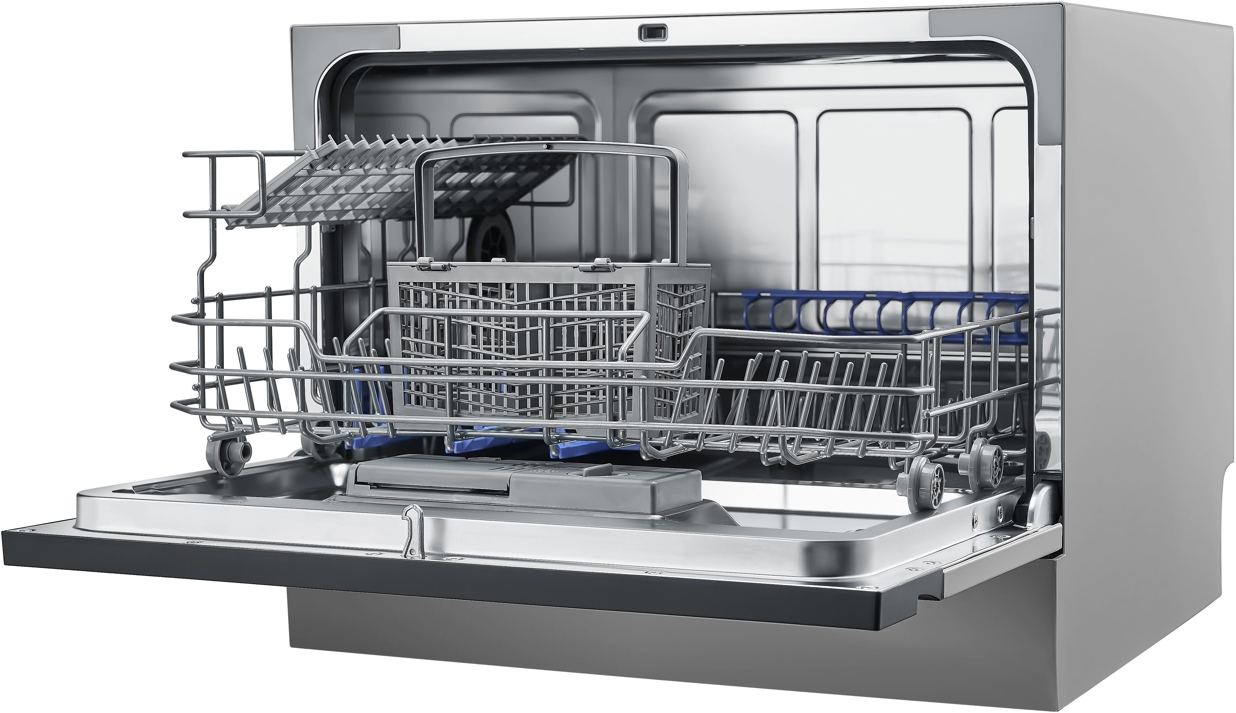 Цвет панели управления посудомоечной машины во многом зависит от типа устройства и расположения управляющих элементов. В большинстве современных посудомоек используется кнопочное либо сенсорное управление. В отдельностоящих и настольных моделях панель управления может быть открытой и располагаться на фронтальной части прибора, что облегчает установку параметров работы и контроль за выполнением программы. Во встраиваемых моделях с возможностью навески декоративного мебельного фасада панель управления чаще всего размещается на верхней кромке дверцы.