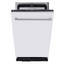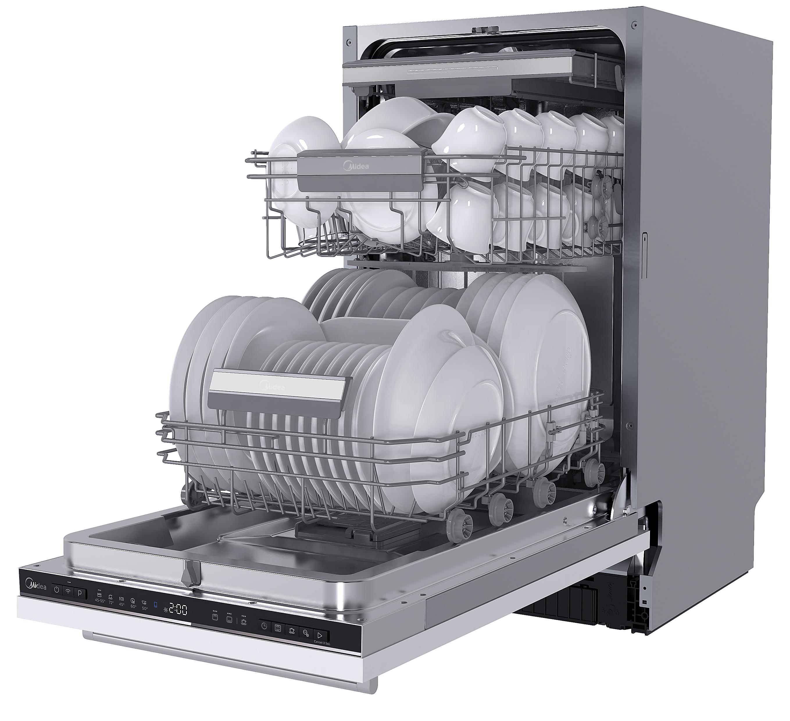 Встраиваемая модель Мидеа отлично впишется в любой интерьер, главное — правильно выбрать место, чтобы подвести коммуникации. Устанавливается в нишу целиком, полностью закрывается декоративной панелью. Обратите внимание: в комплекте не идет фасад, его необходимо установить самостоятельно. Имеет уменьшенную ширину — благодаря этому поместится даже на очень маленькой кухне. В камеру можно загрузить ограниченное число комплектов: 10 шт. Комплектом считается набор посуды на одного человека, который нужен для полноценного приема пищи: глубокая и плоская тарелки, тарелка для салата, блюдце под чашку, сама чашка, ложка и вилка.