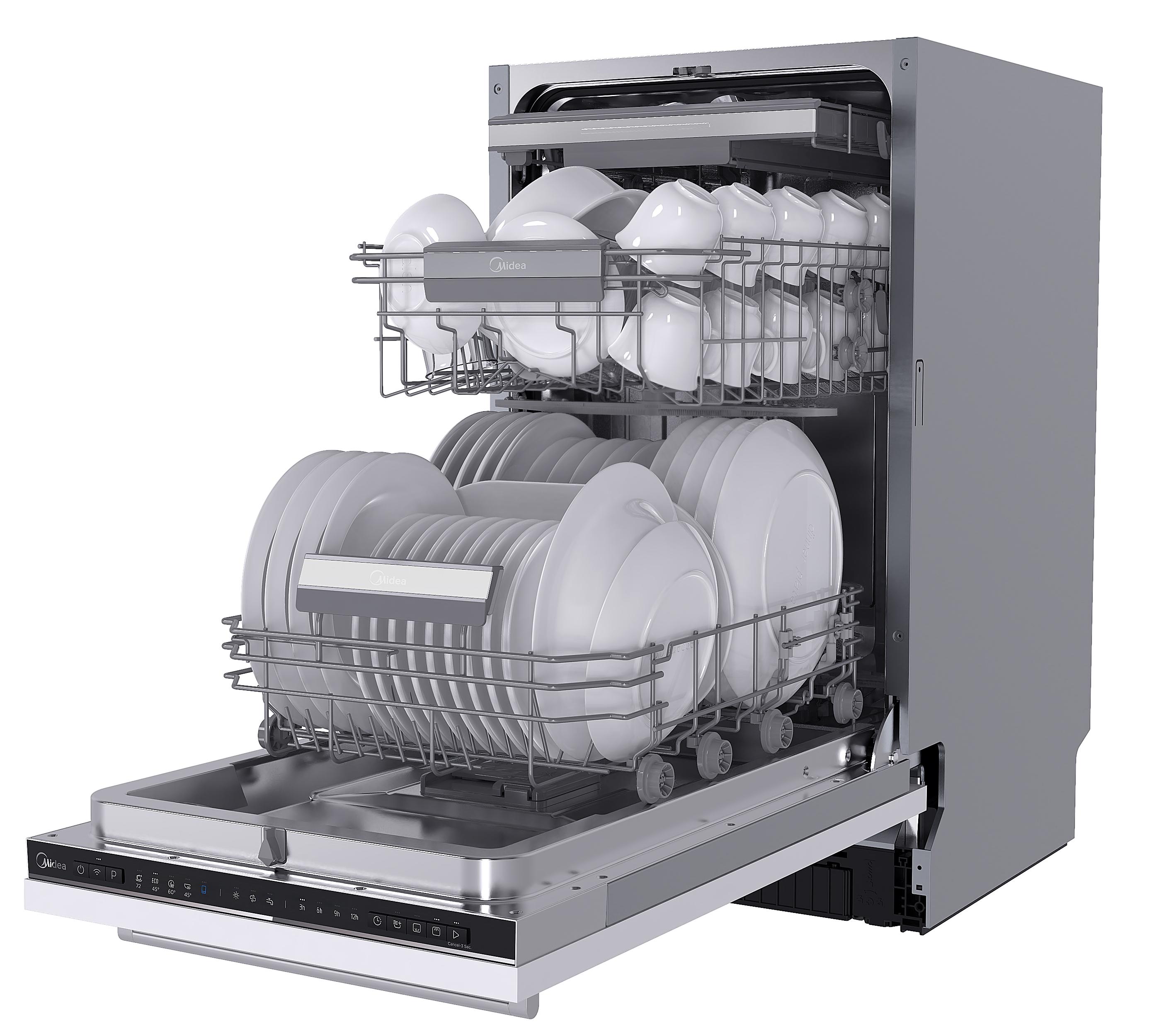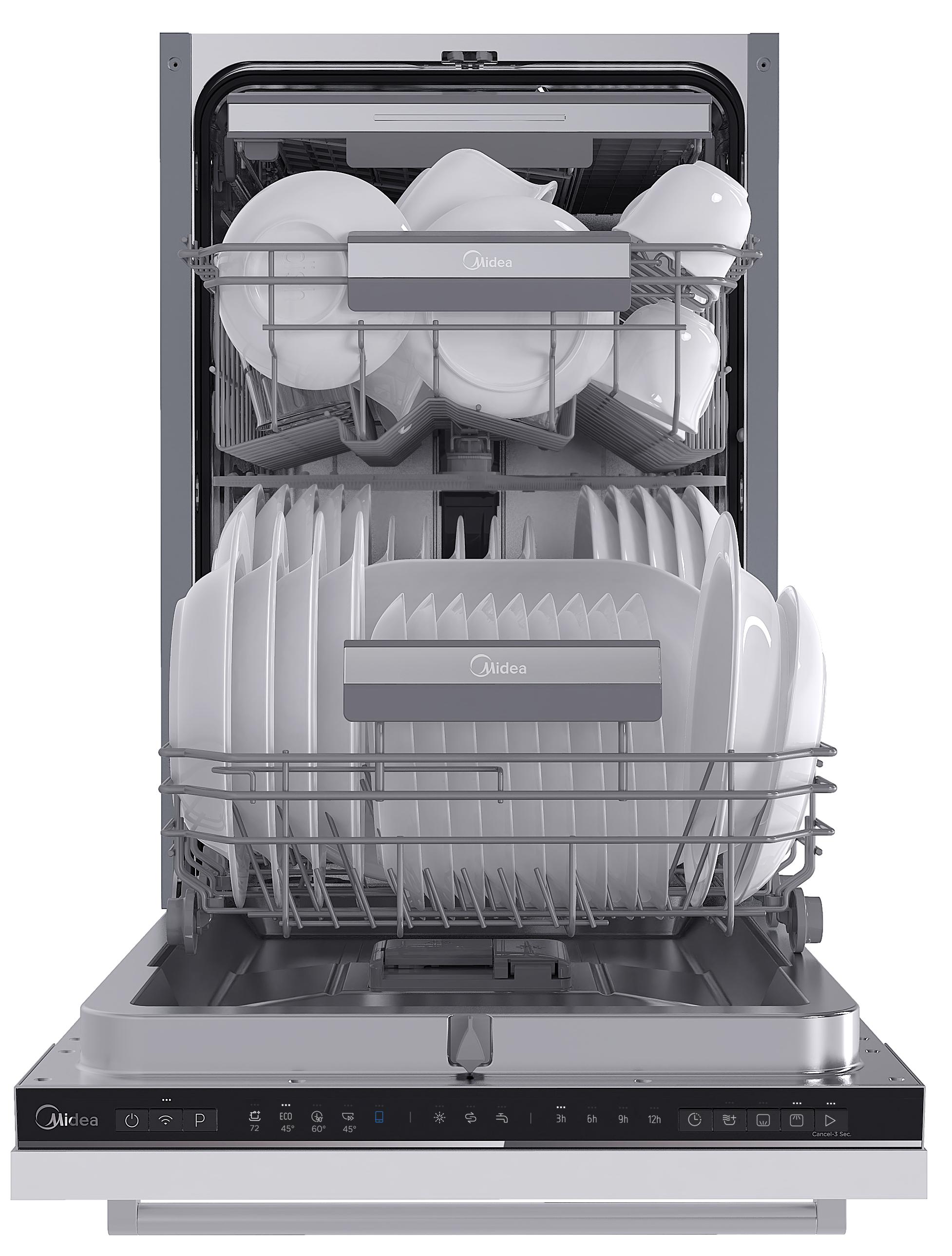Встраиваемая модель Мидеа отлично впишется в любой интерьер, главное — правильно выбрать место, чтобы подвести коммуникации. Устанавливается в нишу целиком, полностью закрывается декоративной панелью. Обратите внимание: в комплекте не идет фасад, его необходимо установить самостоятельно. Имеет уменьшенную ширину — благодаря этому поместится даже на очень маленькой кухне. В камеру можно загрузить ограниченное число комплектов: 10 шт. Комплектом считается набор посуды на одного человека, который нужен для полноценного приема пищи: глубокая и плоская тарелки, тарелка для салата, блюдце под чашку, сама чашка, ложка и вилка.