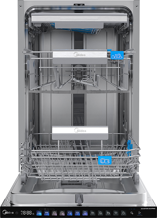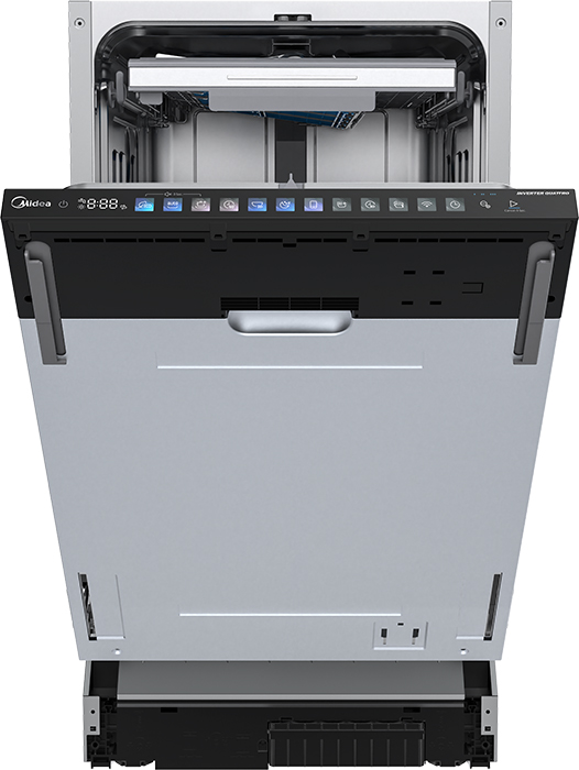 Встраиваемая модель Мидеа отлично впишется в любой интерьер, главное — правильно выбрать место, чтобы подвести коммуникации. Устанавливается в нишу целиком, полностью закрывается декоративной панелью. Обратите внимание: в комплекте не идет фасад, его необходимо установить самостоятельно. Имеет уменьшенную ширину — благодаря этому поместится даже на очень маленькой кухне. В камеру можно загрузить ограниченное число комплектов: 10 шт. Комплектом считается набор посуды на одного человека, который нужен для полноценного приема пищи: глубокая и плоская тарелки, тарелка для салата, блюдце под чашку, сама чашка, ложка и вилка.