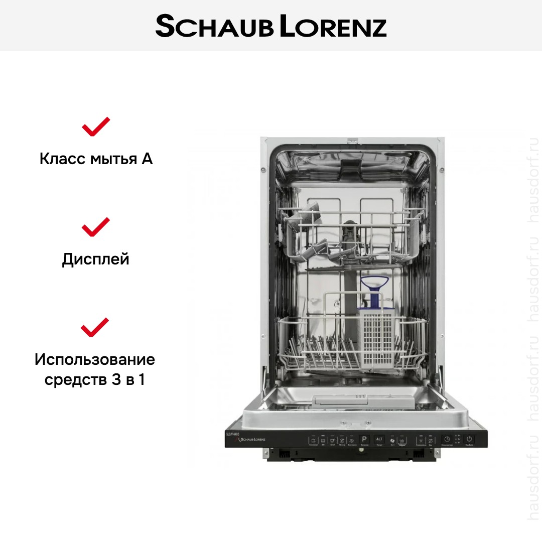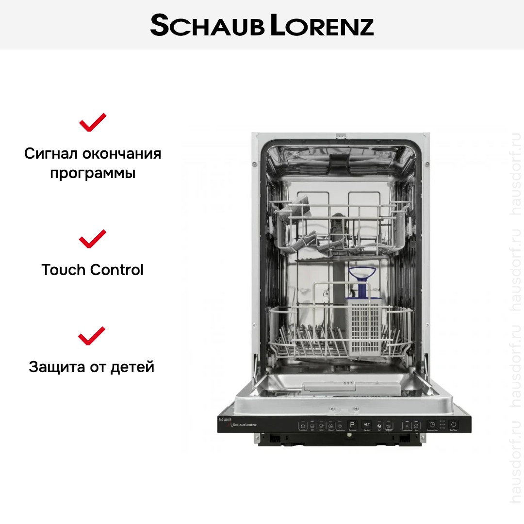 Встраиваемая модель Шауб Лоренц отлично впишется в любой интерьер, главное — правильно выбрать место, чтобы подвести коммуникации. Устанавливается в нишу целиком, полностью закрывается декоративной панелью. Имеет стандартные размеры, поэтому может не поместиться на очень маленькой кухне. В камеру можно загрузить ограниченное число комплектов: 9 шт. Комплектом считается набор посуды на одного человека, который нужен для полноценного приема пищи: глубокая и плоская тарелки, тарелка для салата, блюдце под чашку, сама чашка, ложка и вилка.