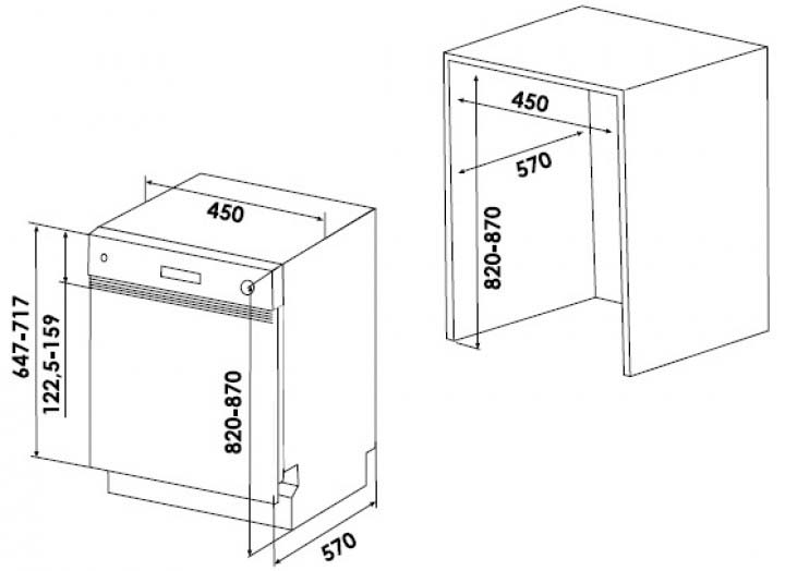 Большая часть полноразмерных и узких посудомоек встраиваемого и отдельностоящего вида имеет высоту около 82-85 см: такие модели легко размещаются под столешницей. Встраиваемые модели несколько ниже, так как у них отсутствует верхняя крышка.