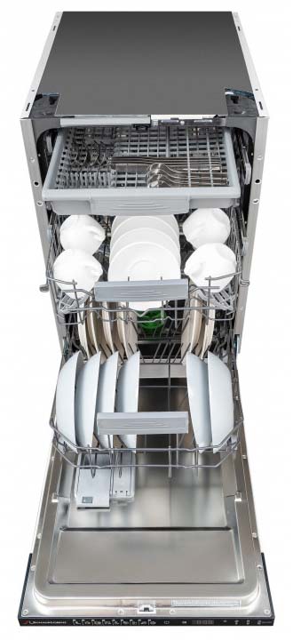 Узкие посудомоечные машины отличает ширина от 44,5 до 45 см при стандартных высоте и глубине и, соответственно, меньшая вместимость, не превышающая 10 комплектов посуды. Обычно это приборы встраиваемого типа, которые легко устанавливаются в узкую мебельную тумбу. Компактные устройства значительно меньше полноразмерных по высоте, а по своей ширине практически от них не отличаются — она составляет от 55 до 60 см. Вместимость подобных небольших машин встраиваемого и отдельно стоящего типа — 4-6 комплектов посуды.