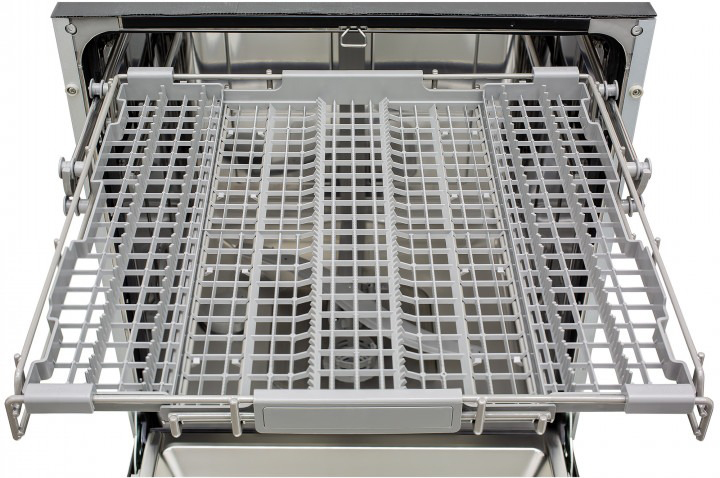 Полноразмерная посудомоечная машина встраивается под столешницу. Она вмещает до 12 стандартных комплектов посуды. При этом вы можете менять высоту верхней корзины, чтобы загрузить в нее кастрюли или сковороды. Индикаторы соли и ополаскивателя позволяют вовремя обновлять моющие средства.