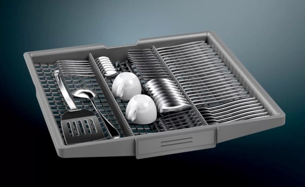 Корзина для столовых приборов — один из обязательных аксессуаров, которыми оснащается любая посудомоечная машина. Она представляет собой сетчатый пластиковый органайзер, в котором устанавливаются в вертикальном положении ложки, ножи и вилки. Корзина, как правило, разделяется на отдельные отсеки, в каждый из которых можно поместить один или несколько предметов. Зачастую сверху она закрывается специальной крышкой, которая также служит для разделения приборов, способствуя более тщательному их мытью.