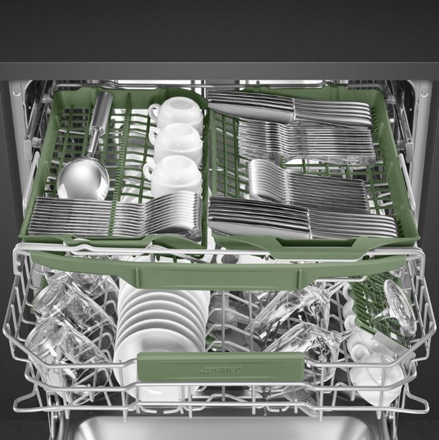 Корзина для столовых приборов достаточно высока, ввиду чего она устанавливается в нижнем коробе, где для нее предусматривается специальное место между разделителями для тарелок. Приборы в корзине могут размещаться как вниз, так и вверх рукоятками — это зависит от количества приборов и требований пользователя. Однако острые предметы — ножи или вилки — необходимо размещать острием вниз для предотвращения травм. Ножи рекомендуется размещать в корзинах с осторожностью, поскольку лезвия из керамики, например, могут затупиться. Чтобы избежать этого, следует использовать фирменные моющие средства и обязательно располагать ножи по отдельности, чтобы они не соприкасались с другими предметами.