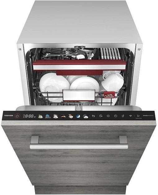 Встраиваемая модель Тошиба отлично впишется в любой интерьер, главное — правильно выбрать место, чтобы подвести коммуникации. Устанавливается в нишу целиком, полностью закрывается декоративной панелью. Обратите внимание: в комплекте не идет фасад, его необходимо установить самостоятельно. Имеет уменьшенную ширину — благодаря этому поместится даже на очень маленькой кухне. В камеру можно загрузить ограниченное число комплектов: 10 шт. Комплектом считается набор посуды на одного человека, который нужен для полноценного приема пищи: глубокая и плоская тарелки, тарелка для салата, блюдце под чашку, сама чашка, ложка и вилка.