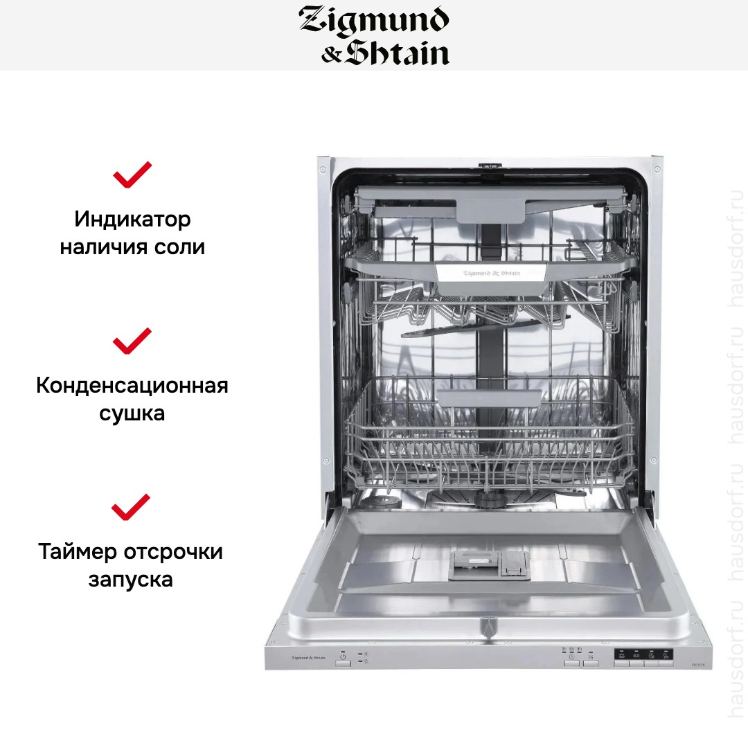 Встраиваемая модель Зигмунд Штайн отлично впишется в любой интерьер, главное — правильно выбрать место, чтобы подвести коммуникации. Устанавливается в нишу целиком, полностью закрывается декоративной панелью. Обратите внимание: в комплекте не идет фасад, его необходимо установить самостоятельно. Имеет стандартные размеры, поэтому может не поместиться на очень маленькой кухне. В камеру можно загрузить ограниченное число комплектов: 14 шт. Комплектом считается набор посуды на одного человека, который нужен для полноценного приема пищи: глубокая и плоская тарелки, тарелка для салата, блюдце под чашку, сама чашка, ложка и вилка.