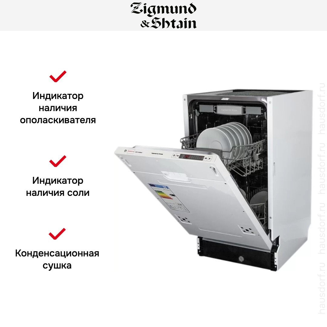 Zigmund Shtain DW 129.4509 X — полновстраиваемая посудомоечная машина с девятью рабочими режимами. Во время выполнения программы на полу отображается луч синего цвета, служащий индикатором работы модели. Для удобства загрузки предусмотрена подсветка внутренней камеры. В устройстве реализована система регулировки потребления соли и ополаскивателя в зависимости от жесткости воды, что позволяет оптимизировать уровень их расхода.