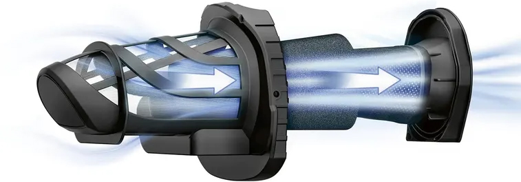 Циклонный фильтр — это усовершенствованный контейнер. Имеет форму обрезанного конуса — благодаря такому устройству воздух двигается циклически, заставляя мусор оседать внизу емкости за счет центробежной силы. Уже очищенный, воздушный поток выходит из пылесоса обратно. Обычно такая форма пылесборника соседствует с несколькими фильтрами, в том числе HEPA.