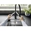 Внутри крана помещается шланг, который можно растянуть, чтобы достать струей воды до второй чаши мойки или тщательно сполоснуть посуду.