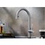 Высокий изогнутый кран удобно использовать для наполнения глубокой посуды. Излив легко выдвигается, шланг обмотан нейлоном. Рычаг управления расположен вертикально, поэтому смесителем удобно пользоваться, даже если он установлен впритык к стене.