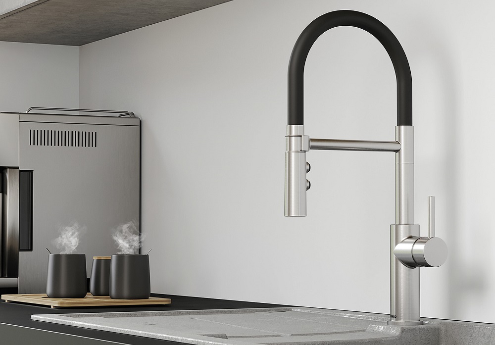 Специальная насадка позволяет выдвинуть излив как маленький шланг и направить струю в слишком высокую кастрюлю, которая не помещается под стационарным краном, на овощи в раковине, на загрязнения в неудобных уголках мойки, которые нужно удалить и т.д. Благодаря особой конструкции вы можете также направить воду из раковины в ванну или из одной чаши мойки в другую одним поворотом крана в нужную сторону. Дополнительная деталь, которая повышает комфорт использования, — аэратор. Он делает поток воды мягче, насыщая его кислородом, таким образом дополнительно уменьшая ее расход: объем струи увеличивается за счет воздуха, а не за счет повышения напора из водопровода.