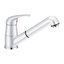 Внутри крана помещается шланг, который можно растянуть, чтобы достать струей воды до второй чаши мойки или тщательно сполоснуть посуду.