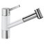 Внутри крана помещается шланг, который можно растянуть, чтобы достать струей воды до второй чаши мойки или тщательно сполоснуть посуду.