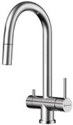 Специальная насадка позволяет выдвинуть излив как маленький шланг и направить струю в слишком высокую кастрюлю, которая не помещается под стационарным краном, на овощи в раковине, на загрязнения в неудобных уголках мойки, которые нужно удалить и т.д. Дополнительная деталь, которая повышает комфорт использования, — аэратор. Он делает поток воды мягче, насыщая его кислородом, таким образом дополнительно уменьшая ее расход: объем струи увеличивается за счет воздуха, а не за счет повышения напора из водопровода. К этой модели можно подключить фильтр для питьевой воды.