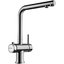Рычаг для включения фильтрованной воды применяется в современных комбинированных смесителях, где из одного и того же излива подается и водопроводная, и питьевая вода. Такие смесители типа «два в одном» отличаются от обычных тем, что имеют не два подключения, а три, где третье соединяет смеситель с фильтром. Очищенная вода подается по изолированной трубке, проходящей внутри излива. Для удаления накипи, солей металлов, микроорганизмов и прочих вредных примесей могут применяться различные типы фильтров. Проточные фильтры устанавливаются под мойкой и включают несколько картриджей, которые необходимо менять по мере использования. С их помощью можно избавиться от таких примесей, как железо, хлор и многие другие. Устройства с системой обратного осмоса оснащаются диффузором, включающим картриджи для предварительной очистки и осмотическую мембрану, задерживающую практически все вредные примеси.