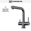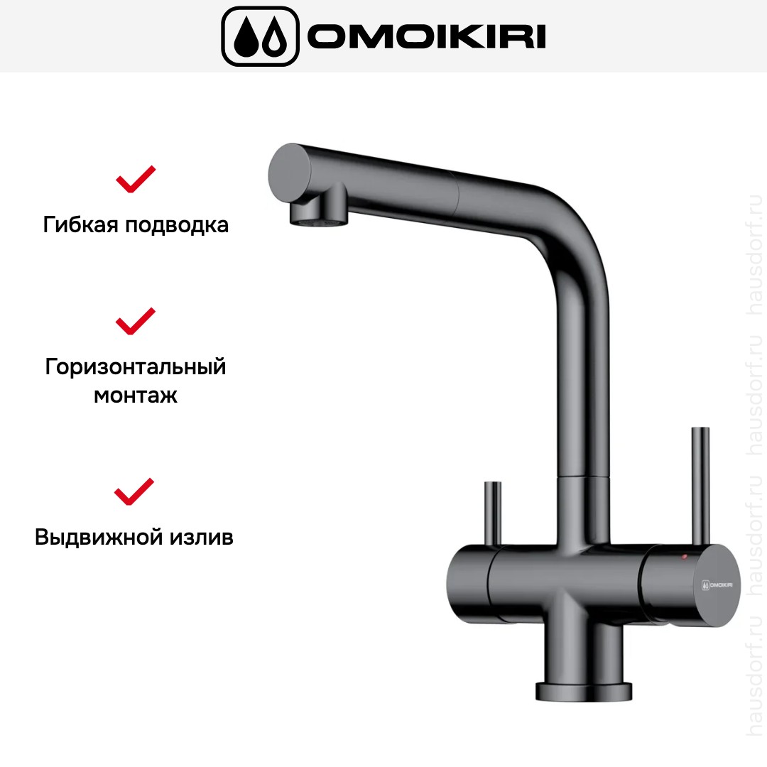 Смеситель Omoikiri Takamatsu-S GM обладает выразительным внешним видом и продуманной функциональностью, сочетая индустриальную эстетику с практичностью для современной кухни: корпус выполнен из латуни с покрытием цвета вороненой стали, что придает изделию строгий и насыщенный тон, совместимый с металлическими и деревянными рабочими поверхностями; компактные габариты 24.1×15.2×29.5 см и общая высота 295 мм сохраняют удобство при установке в условиях ограниченного пространства, а одновременно обеспечивают достаточный запас для работы с крупной посудой. Конструкция с двумя рычагами позволяет разделять управление подачей и направлением потока, а отдельная ручка отвечает за подачу профильтрованной воды, что делает использование комфортным при подключении системы очистки: предусмотрена возможность подсоединения фильтра для питьевой воды, а дополнительный управляющий орган позволяет быстро переходить между обычной и очищенной водой без смены смесителя. Высокий носик высотой 25.8 см и выдвижной выпрямляемый элемент длиной 19.8 см при угле поворота 360° обеспечивают превосходную мобильность и охват рабочей зоны, облегчая заливку широких емкостей и мытье в нескольких направлениях; выдвижная часть удобна при необходимости направить поток напрямую под углы раковины, а поворотный диапазон не ограничивает свободу движения. Внутреннее наполнение ориентировано на долговечность и надежность: запорный клапан выполнен в виде керамического картриджа диаметром 35 мм, что гарантирует точное регулирование и минимальный износ при частой эксплуатации, а наличие аэратора снижает разбрызгивание и экономит расход воды, сохраняя приятное ощущение струи. Для монтажа потребуется одно отверстие диаметром 35 мм и горизонтальный способ установки, при этом подвод выполнен гибкими шлангами стандарта 1/2″, что облегчает подключение к существующим коммуникациям и исключает сложность при выравнивании; гибкая подводка и комплектные соединения позволяют быстро завершить сборку и приступить к эксплуатации. Дизайн продуман также с точки зрения обслуживания: внешние поверхности устойчивы к воздействию влаги и бытовых загрязнений, что упрощает уход, а конструктивные решения минимизируют вероятность протечек в местах сочленений. Эта модель предлагает гармоничное сочетание стиля и инженерных решений: она подходит тем, кто ценит строгую отделку и функциональные возможности — от выдвижного носика и полного поворота до отдельного управления фильтрованной водой — без лишних компромиссов между формой и назначением, обеспечивая удобство в повседневных задачах и долгий срок эксплуатации благодаря качественным материалам и продуманной гидравлической части.