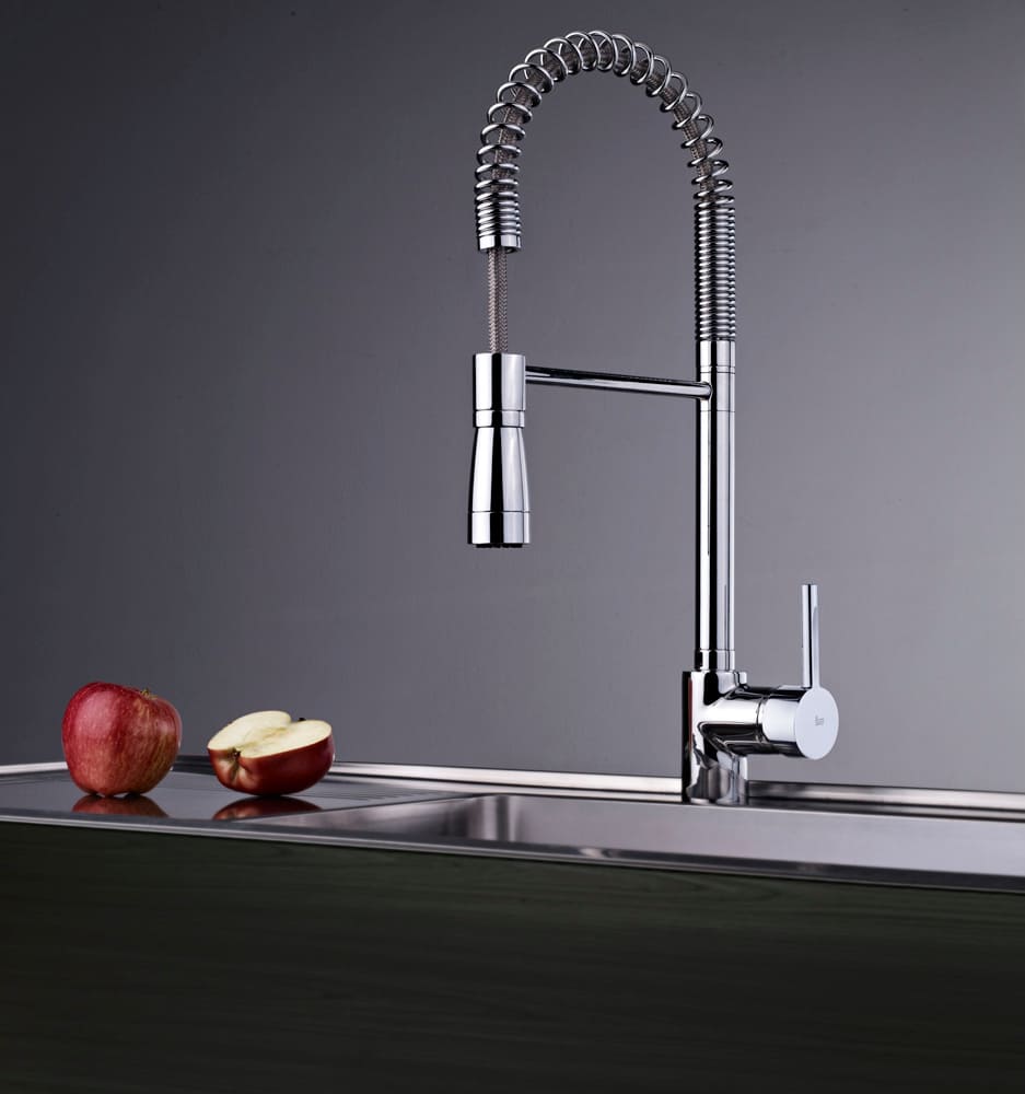 Для использования режима душа смесители оснащаются, как правило, выдвижным изливом, который имеет насадку-душ. В конструкцию у них добавляется элемент, который способен переключать направление струи с обычного излива на гибкий. Отдельный гибкий шланг вытягивается наружу за эту насадку из корпуса излива. Длина его может составить до 1,5 м, что поможет также вымыть все уголки раковины и наполнить емкости любого размера. Кроме смесителей с одним выдвижным изливом , производители предлагают полупрофессиональные модели с двумя изливами.