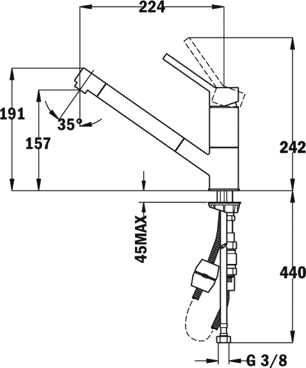 Внутри крана помещается шланг, который можно растянуть, чтобы достать струей воды до второй чаши мойки или тщательно сполоснуть посуду.