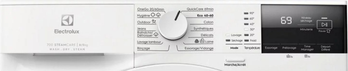 Эта модель — комбинация стирки и сушки, что полезно людям, которые не могут или не хотят приобретать отдельно сушильную машину, при этом в квартире нет балкона или лоджии, чтобы с комфортом сушить одежду на веревках. Вы можете отложить запуск, если хотите сэкономить на тарифах и включить машинку ночью, либо если планируете развесить белье сразу после возвращения работы и не ждать, пока закончится цикл. На панели управления отображаются разнообразные индикаторы, чтобы было проще следить за процессом, например: хода программы, температуры стирки, скорости отжима, времени до окончания стирки, блокировки дверцы, сушки, старт/пауза, отсрочки старта. Скорость отжима достигает 1400 оборотов в минуту. Функцию отжима можно будет отключить вручную, если она вам не нужна.