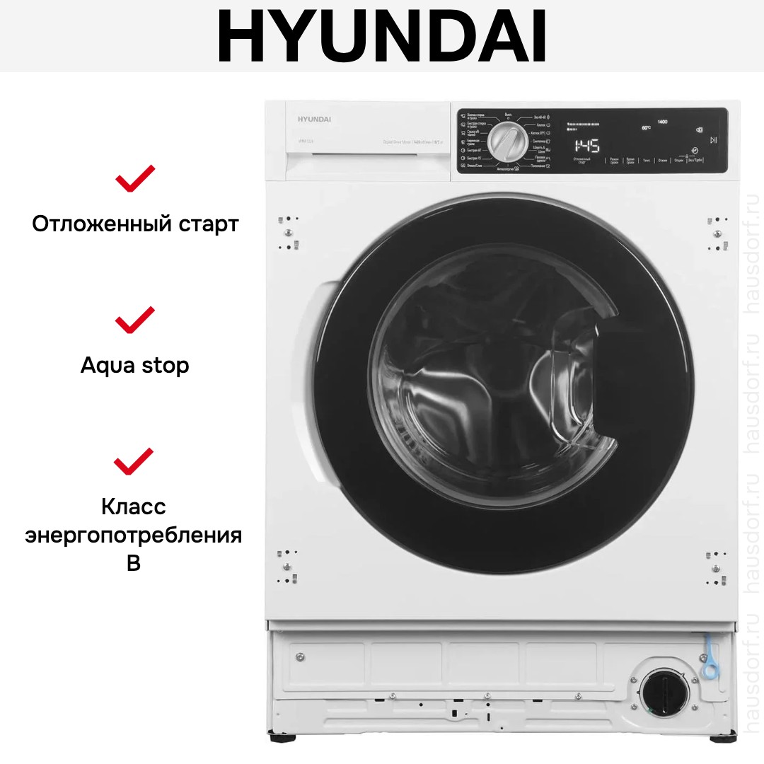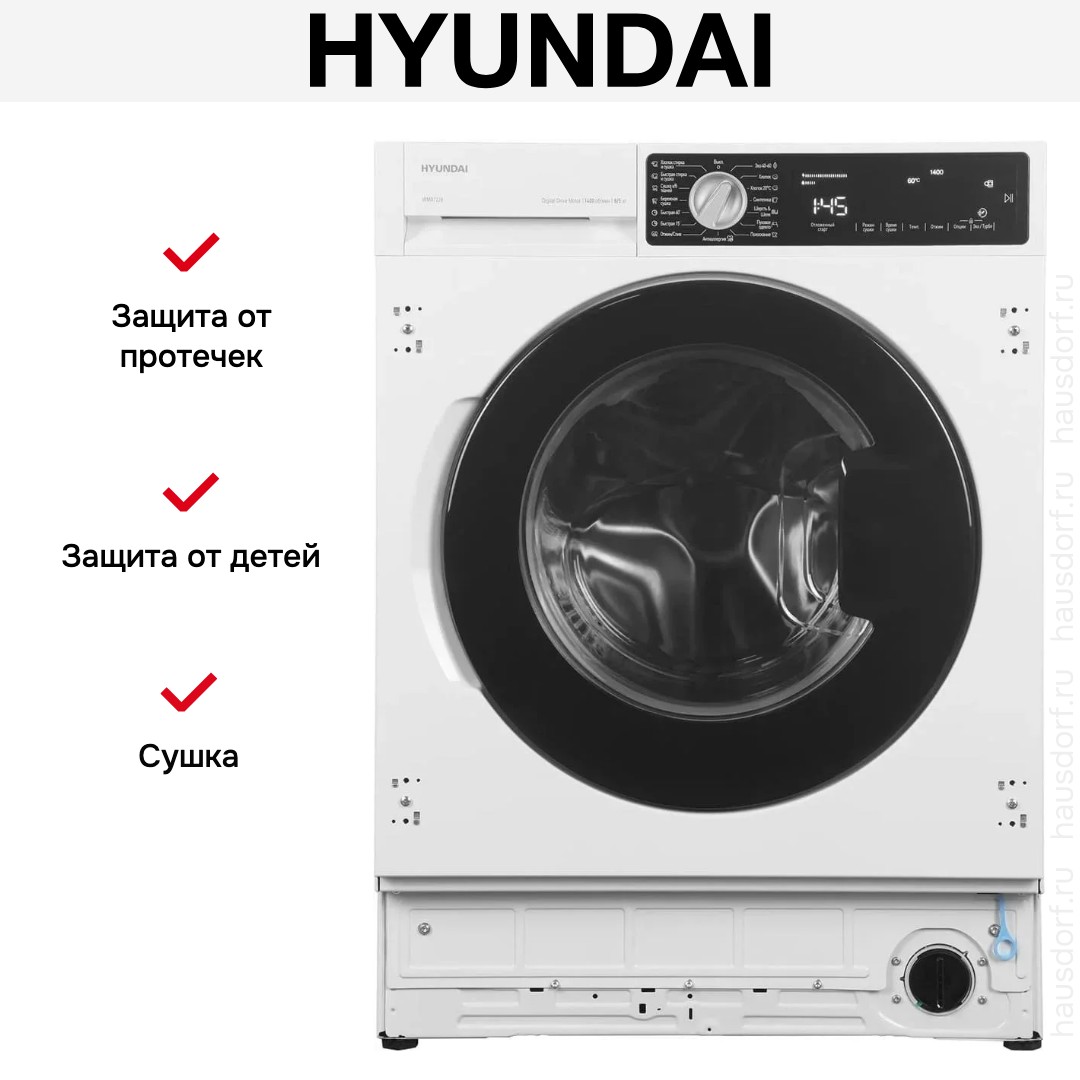 Стирально-сушильная машина Hyundai WMD7228 создана для комфортного домашнего использования и органично вписывается в планировку современной кухни.